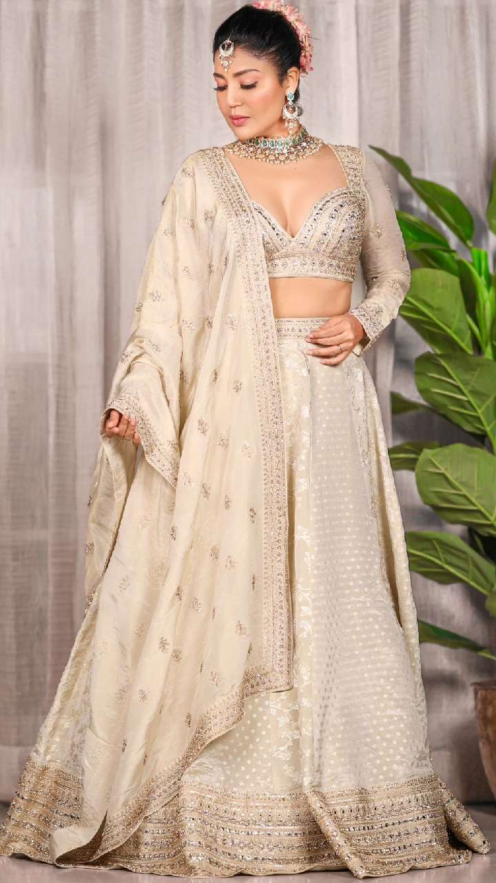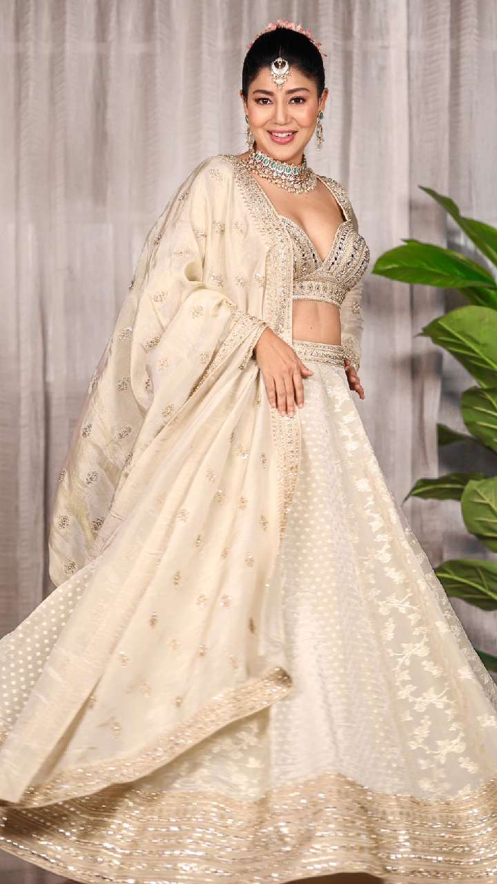 इस दिवाली आप एक्ट्रेस की तरह ऑफ व्हाइट कलर का सिल्क लहंगा टाई कर सकती हैं। इसके साथ डीप नेक चोली गजरा बन हेयर स्टाइल ग्लॉसी मेकअप और सिल्वर ज्वैलरी लुक में चार चांद लगा रही है।