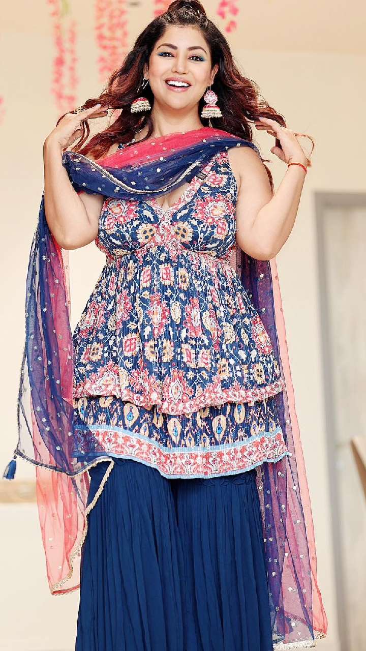 आजकल ऐसे शरारा सूट का भी खूब फैशन है। ऐसे में आप चाहे तो प्लेन शरारा विद प्रिंटेड कुर्ती लुक को स्टाइल करके त्योहारों पर जलवा दिखा सकती हैं।
