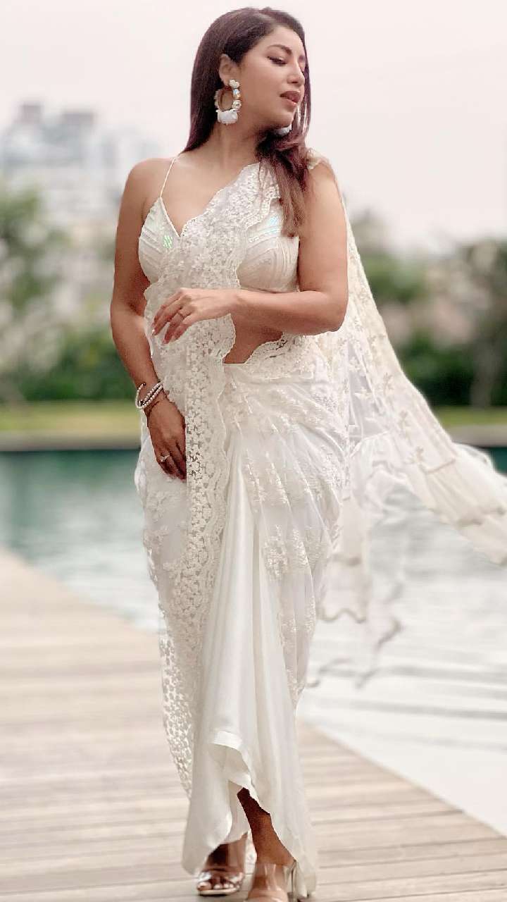 अभिनेत्री व्हाइट कलर की इंडो-वेस्टर्न साड़ी में बेहद बोल्ड अंदाज में नजर आ रही हैं। आप भी उनके इस लुक को कॉपी कर सकती हैं।