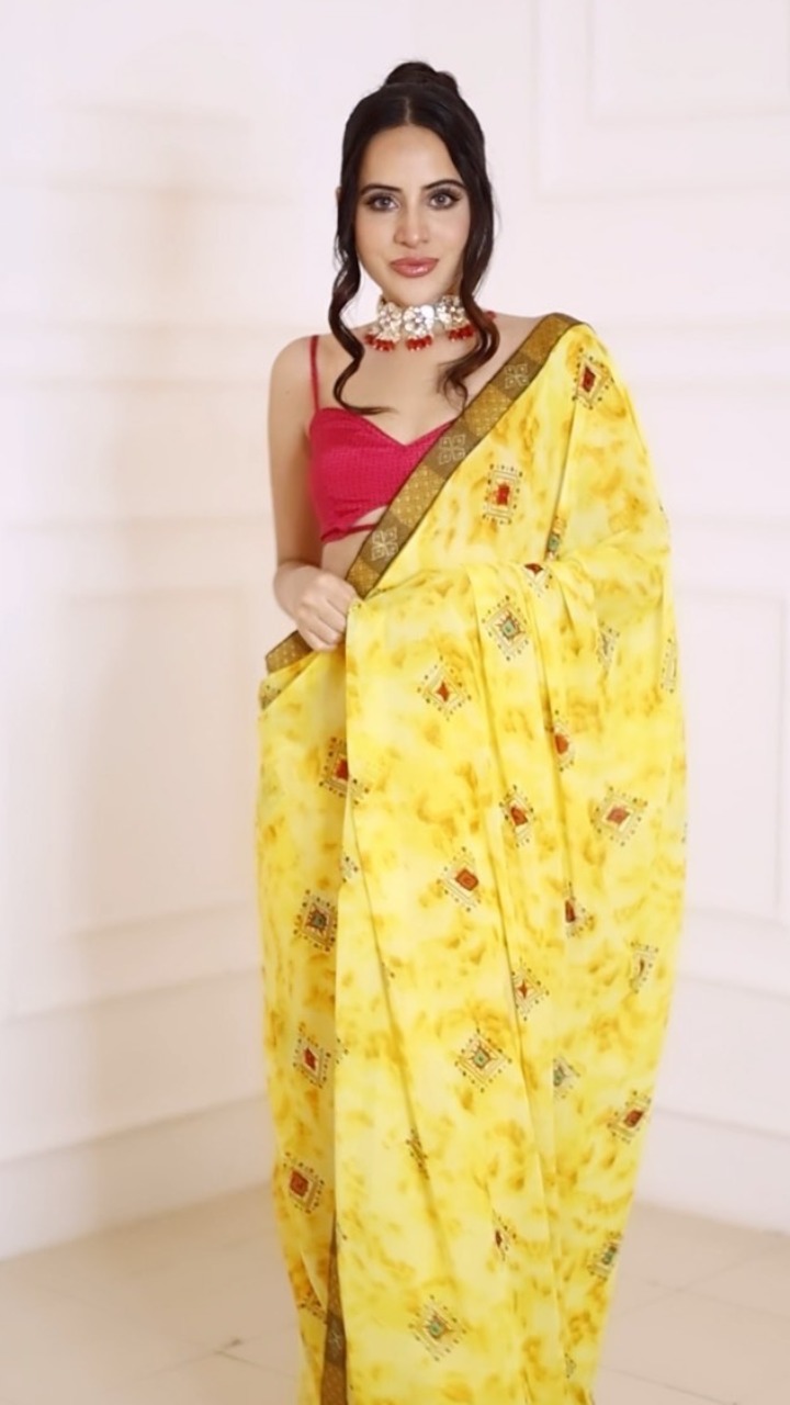 गोल्डन कलर की साड़ी में अपना पल्लू गिराते हुए उर्फी तापमान में गर्मी को बढ़ाते नजर आ रही हैं।