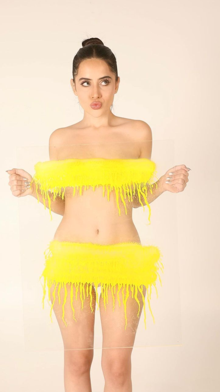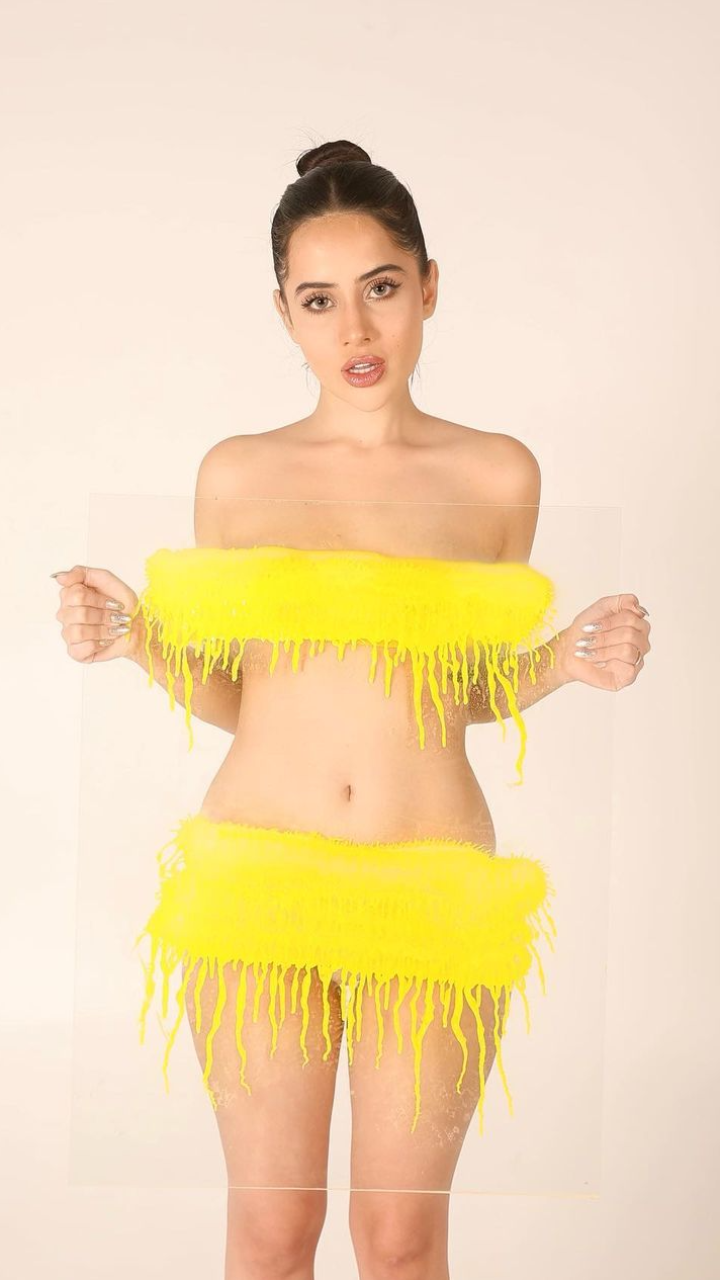 इस बार उर्फी ने बॉडी को कांच से ढ़का हैं। कांच में दो जगह येलो कलर का पेंट है।