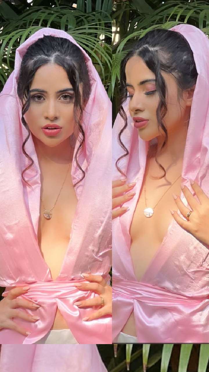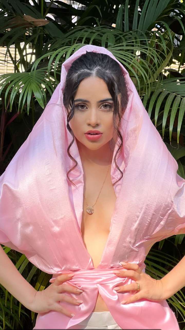 उर्फी ने पिंक कलर की सेटिन शर्ट से हेड स्कार्फ बनाया है। उनका यह लुक सोशल मीडिया पर वायरल हो रहा है।