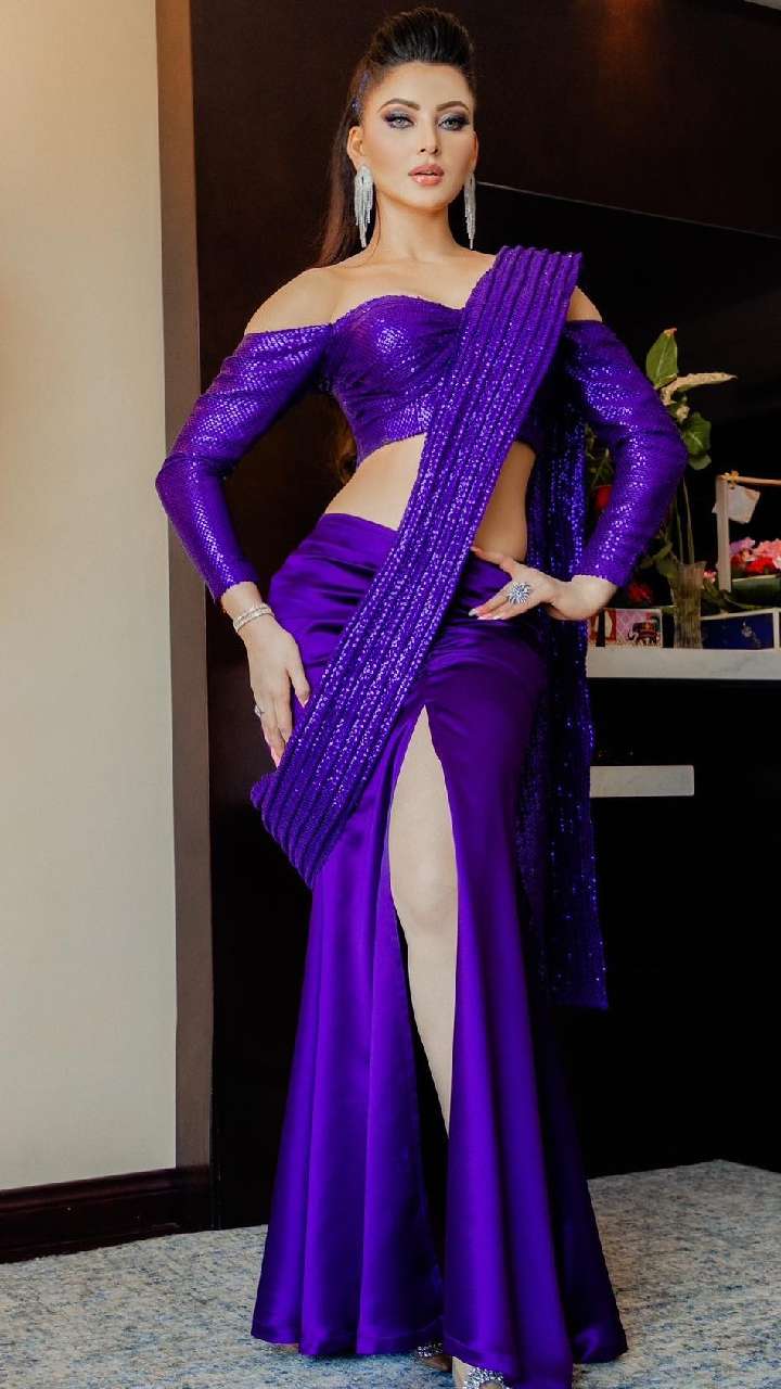 पर्पल कलर की इंडो-वेस्टर्न साड़ी के साथ एक्ट्रेस ने डाउन शोल्डर ब्लाउज पहना है। एक्ट्रेस का ये लुक पार्टी के लिए परफेक्ट है।
