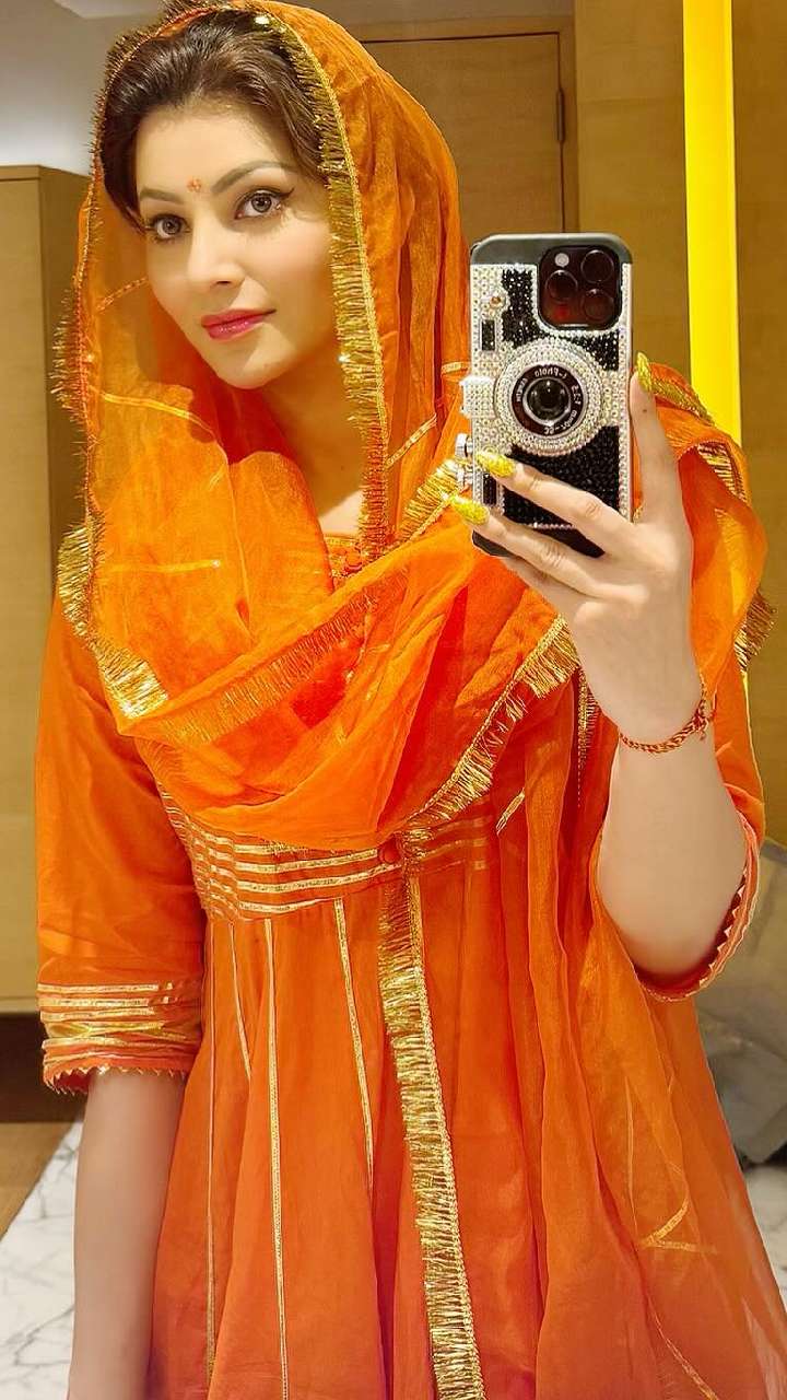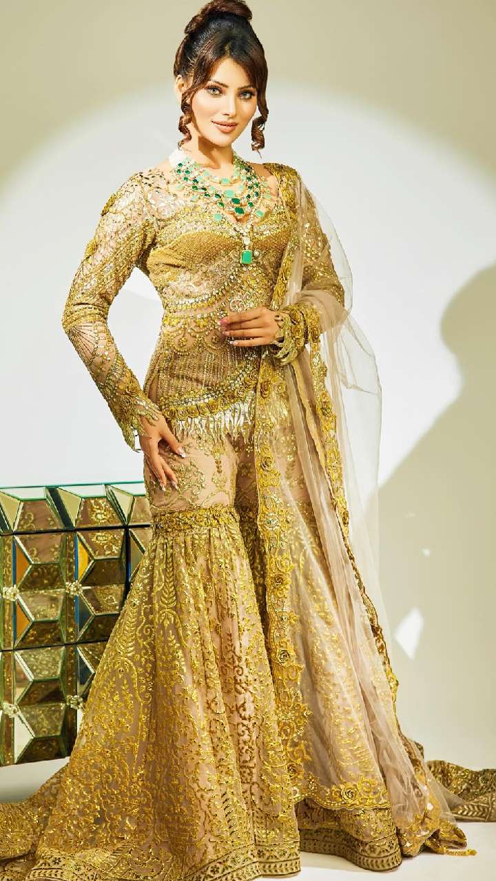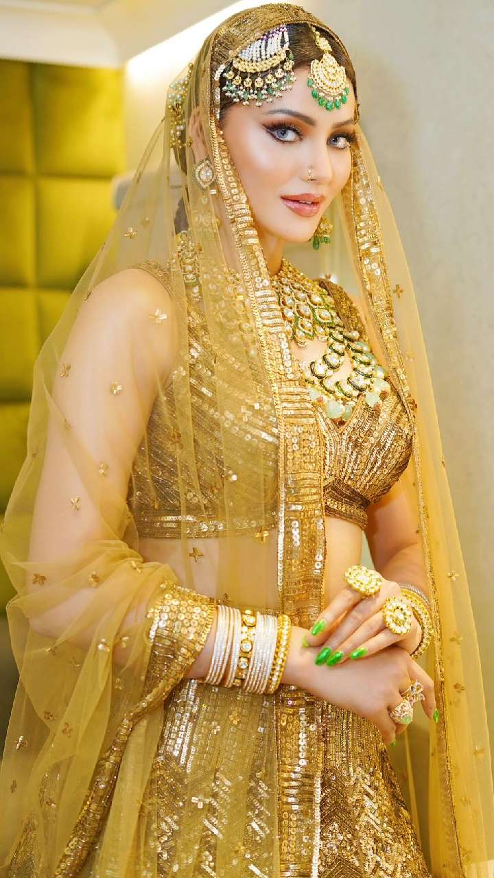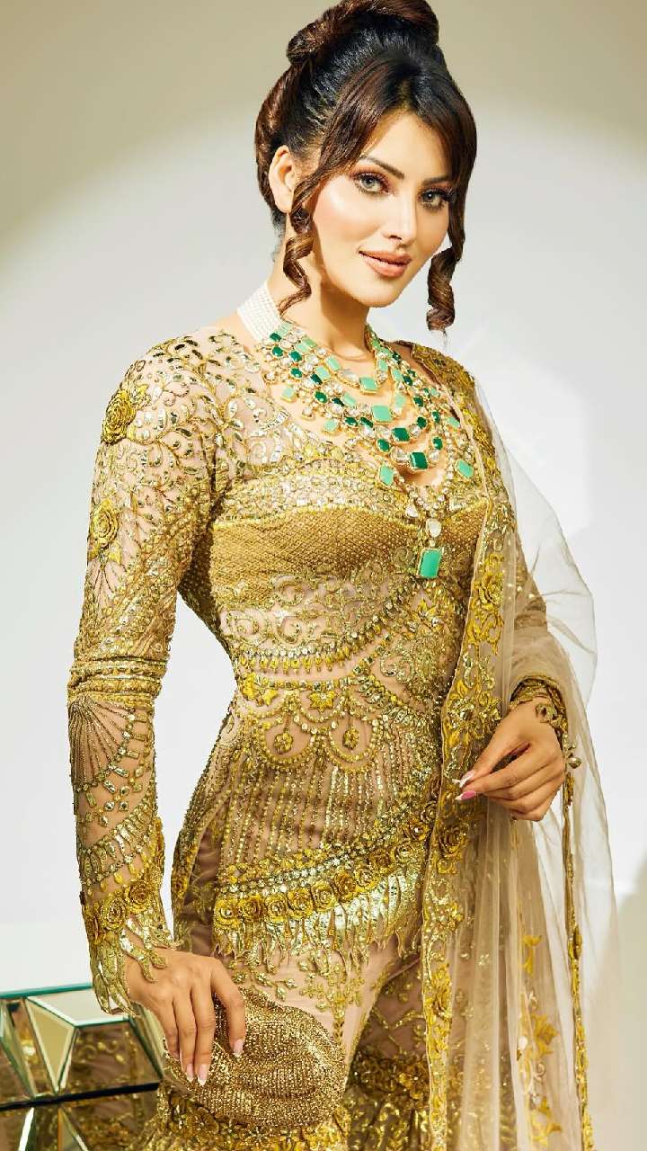उर्वशी रौतेला ने गोल्डन कलर के हैवी वर्क शरारा सूट में अपना गॉर्जियस लुक शेयर किया है। इसके साथ मल्टीलेयर नेकपीस हाई बन विद फ्रंट फ्लिक्स हेयर में डीवा कहर ढहा रही हैं।