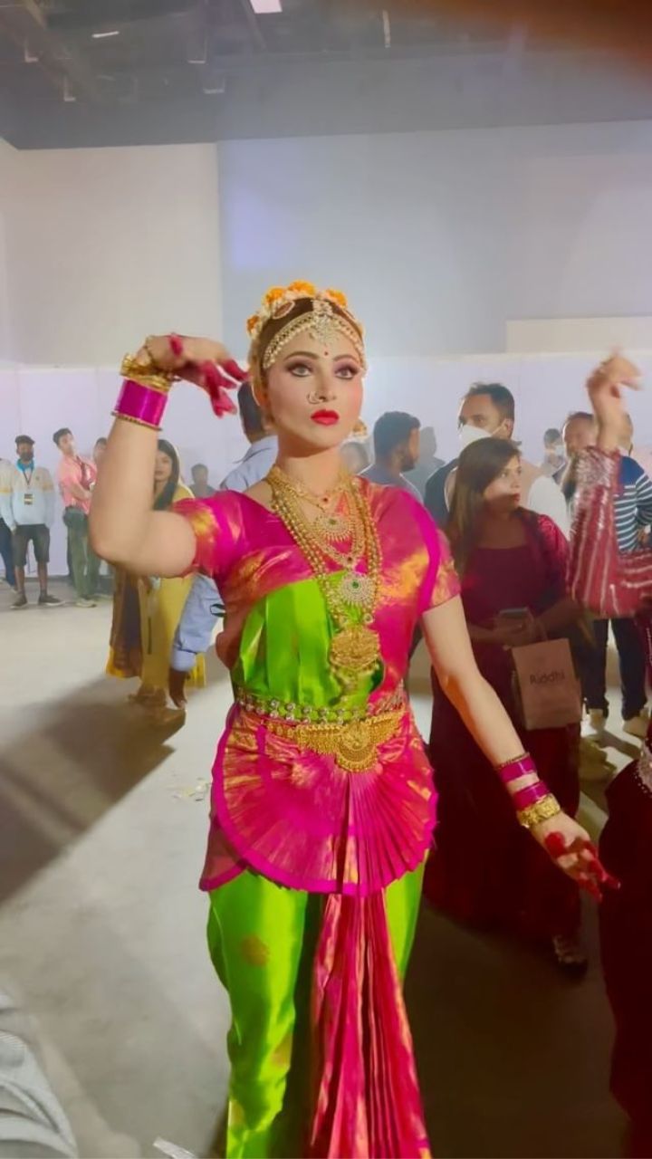 उर्वशी ने तस्वीर में भरतनाट्यम के लिए ये कलरफुल साड़ी पहनी थी, उनका ये लुक लोगों को बेहद पसंद आया था।
