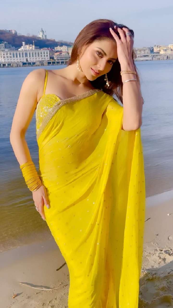 उर्वशी इस गोल्डन साड़ी में बला की खूबसूरत लग रही हैं।