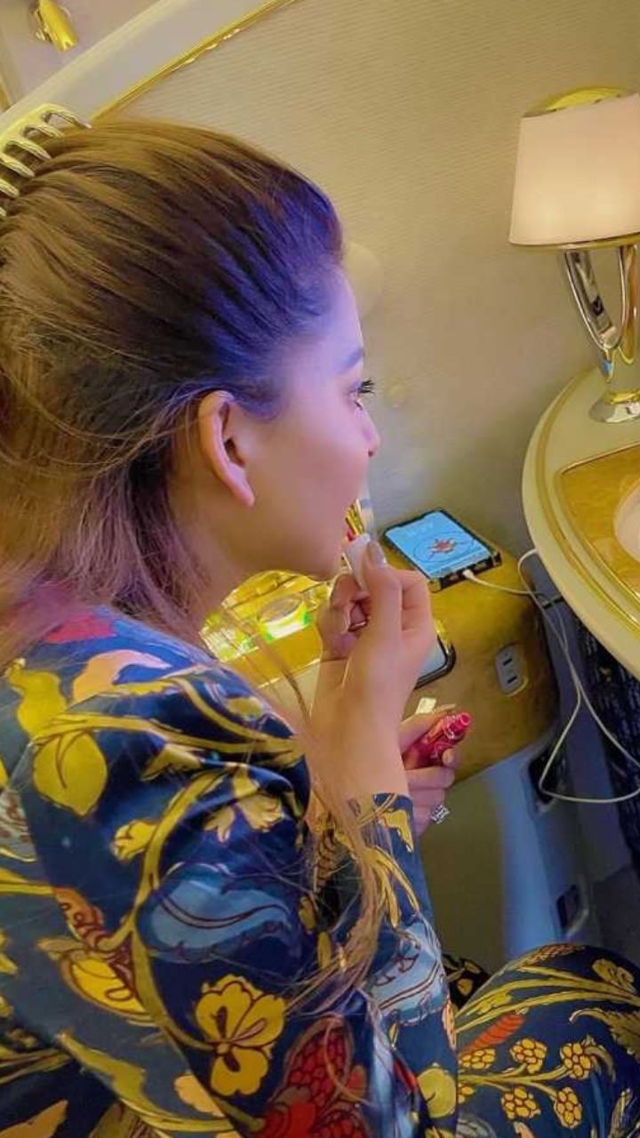 तस्वीर में उर्वशी ओंठो पर लिपस्टिक लगाते हुए शीशे को तरफ देख रही है।