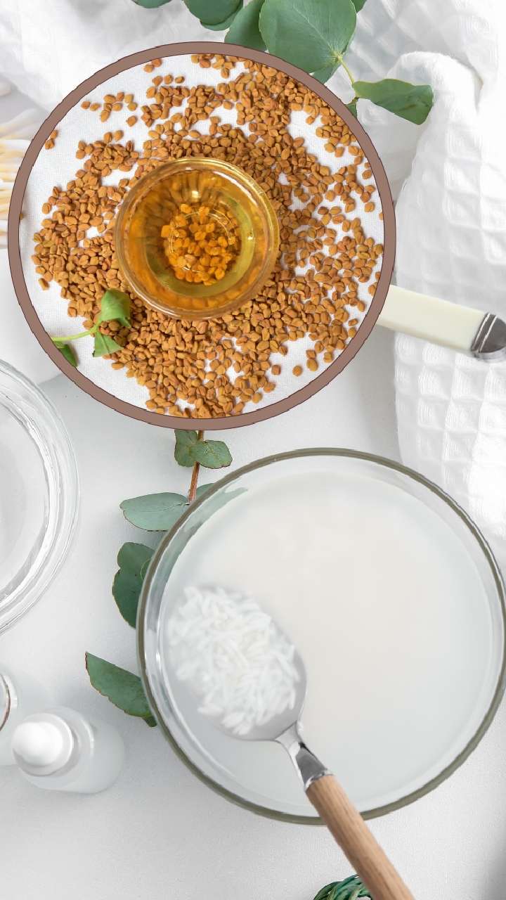 चावल के पानी के साथ आपको मेथी के बीज मिक्स करके लगाना चाहिए। यह आपके बालों को न सिर्फ टूटने से बचाएगा, बल्कि इससे आपके बाल भी मजबूत होंगे।