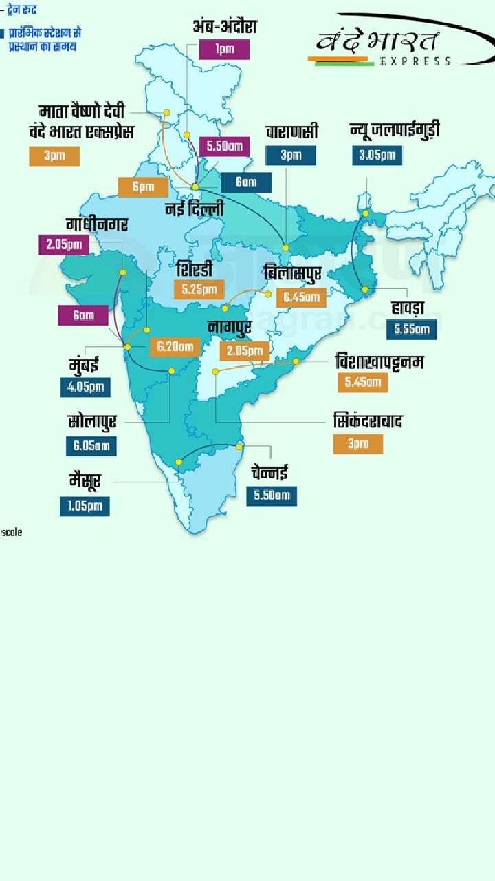वंदे भारत एक्सप्रेस ट्रेन नई दिल्ली से अलग-अलग 3 राज्यों की यात्रा तय करती है। पहली नई दिल्ली से वाराणसी, दूसरी जम्मू (कटरा) और तीसरी अंब-अंदौरा (हिमाचल प्रदेश) का सफर तय करती है।