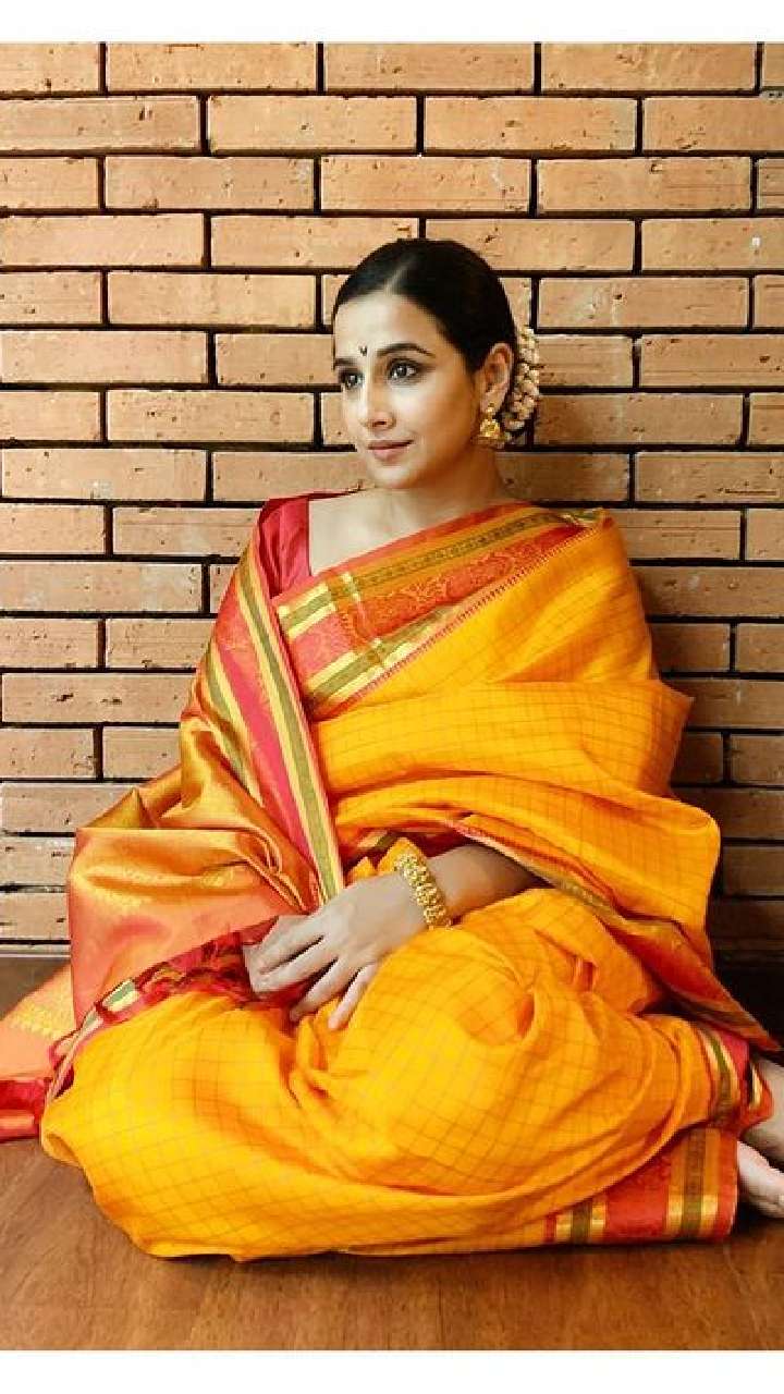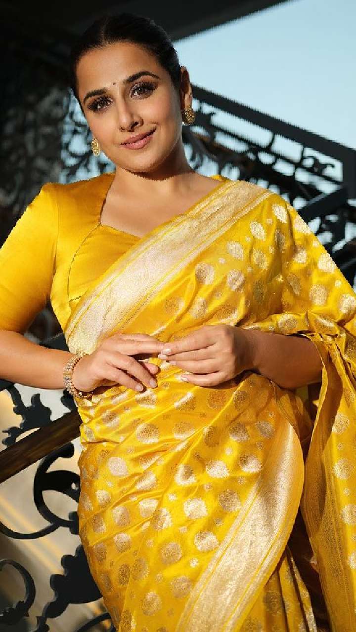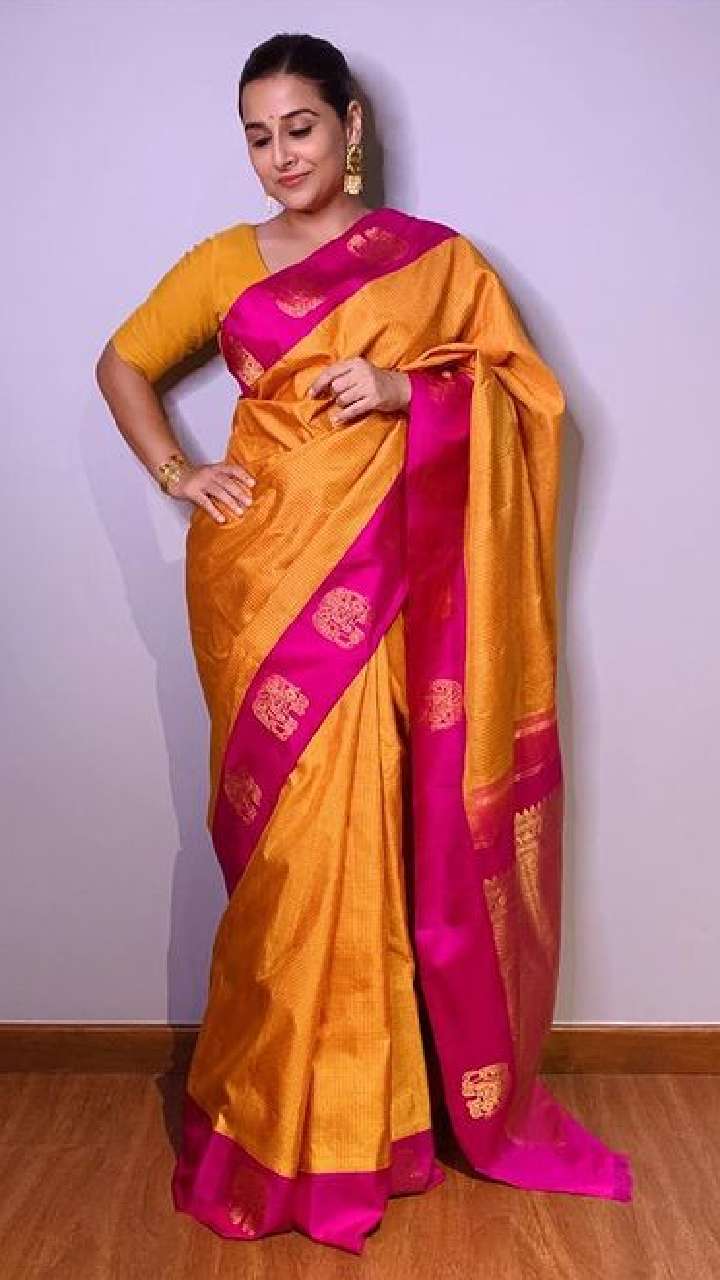 विद्या बालन की ये येलो और पिंक कलर साड़ी आपको किसी भी पार्टी में प्रिटी लुक देगी।