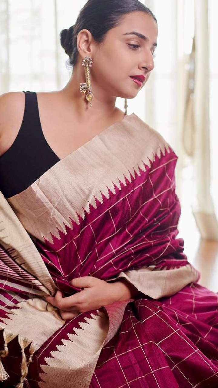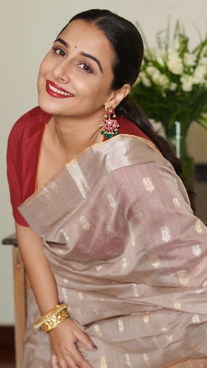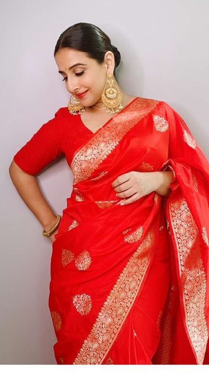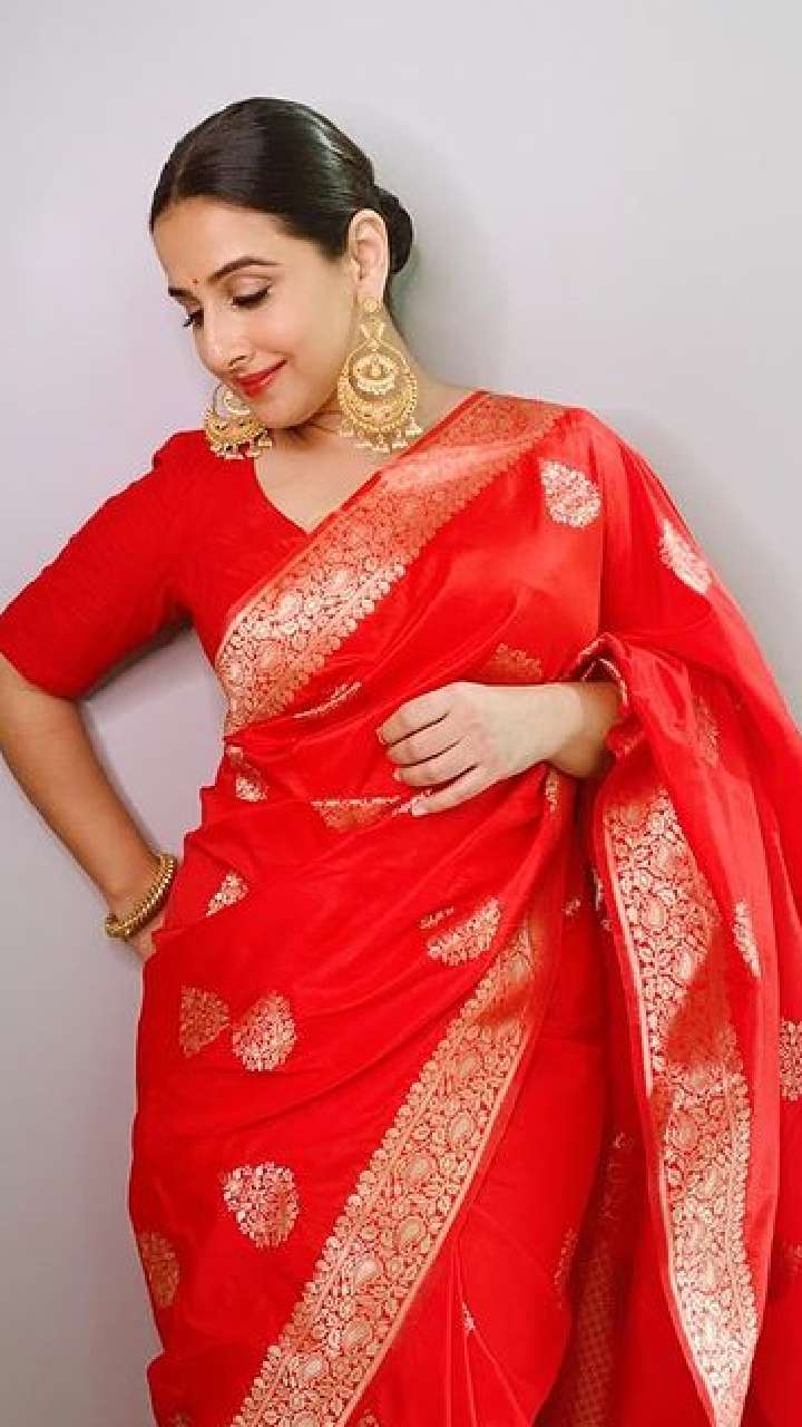 विद्या बालन इस रेड कलर की बनारसी साड़ी में बेहद खूबसूरत दिख रही हैं।