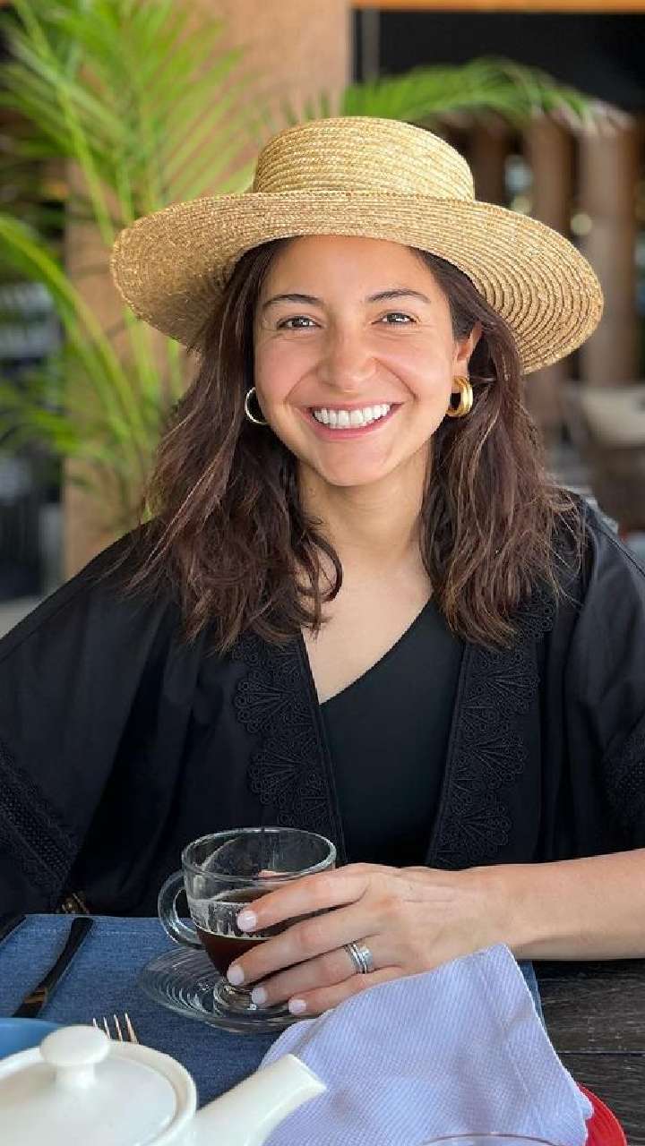 ट्रैवलिंग की शौकीन अनुष्का ब्लैक ड्रेस और हैट लगाए किसी रेस्तरां में एन्जॉय करती नजर आ रही हैं।