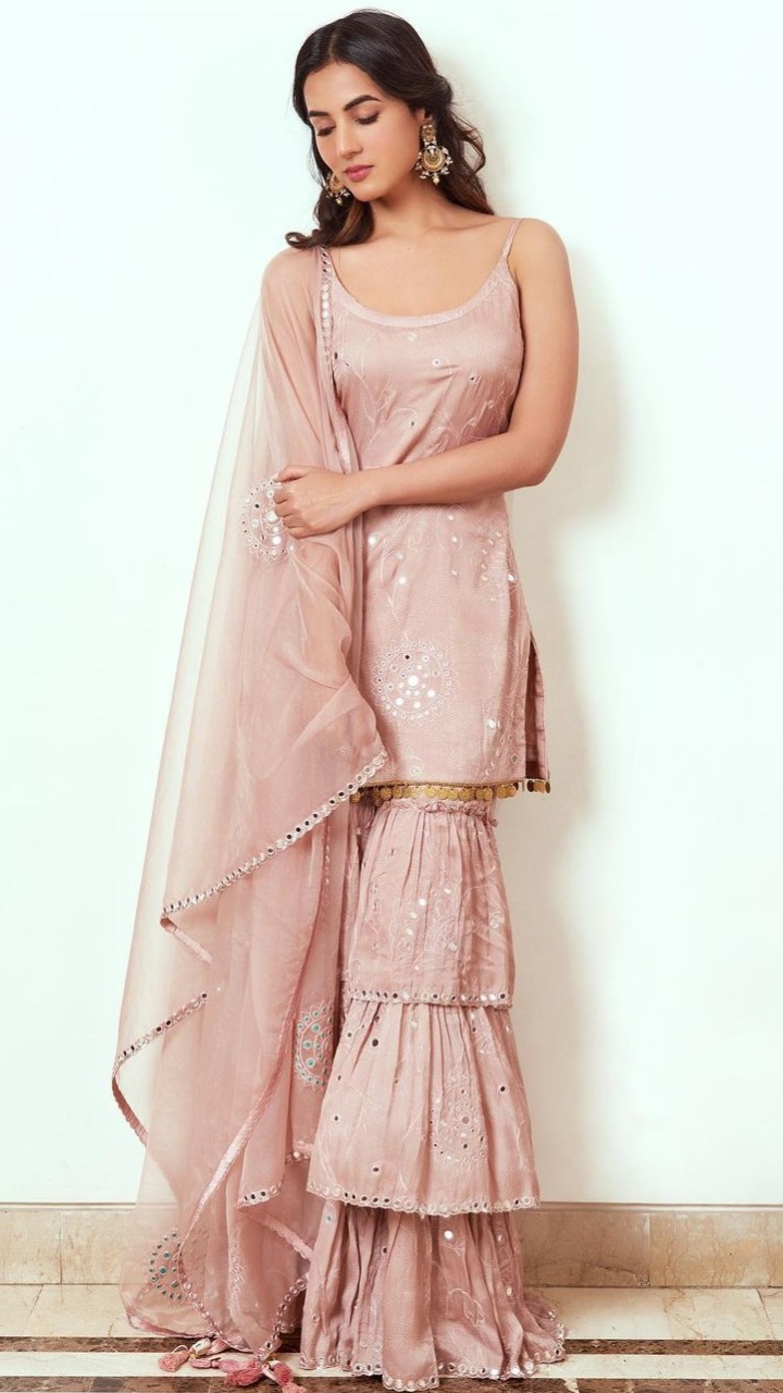 पीच कलर के एंबॉयडर्ड शरारा सेट में सोनल का ये लुक काफी प्यारा हैं। फीमेल फैंस एक्ट्रेस के इस लुक को वेडिंग अटेंड करने के लिए ट्राई कर सकते हैं।