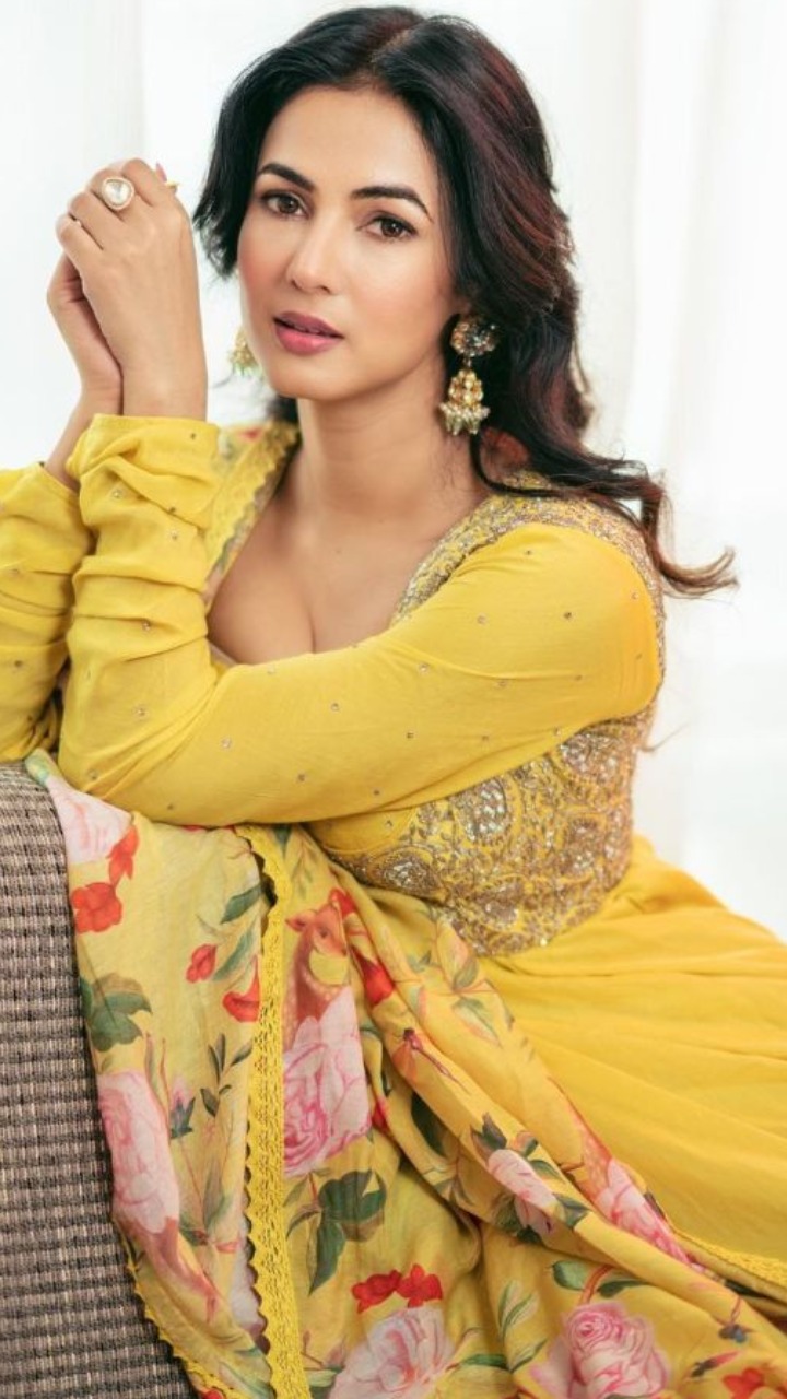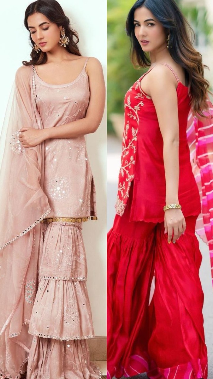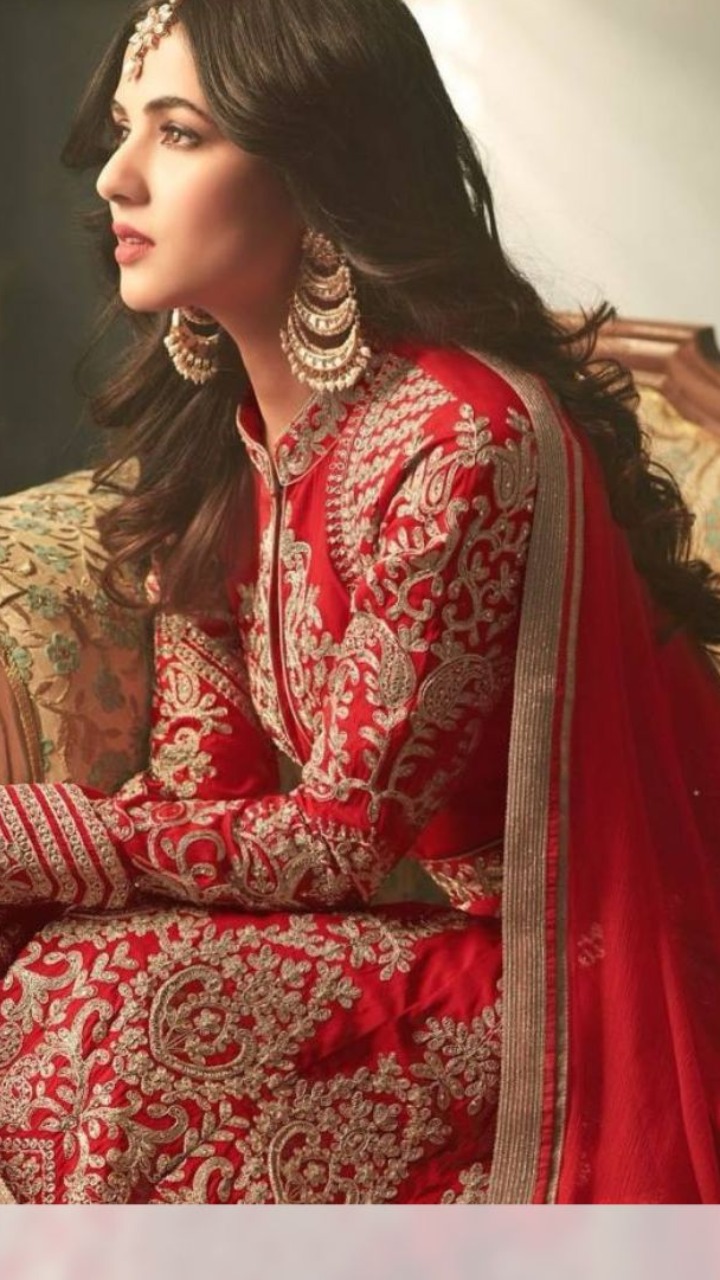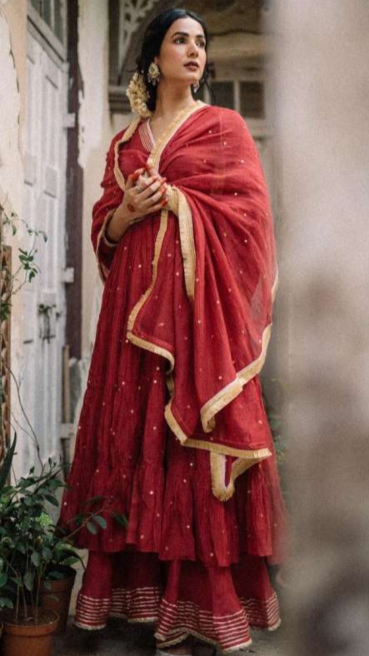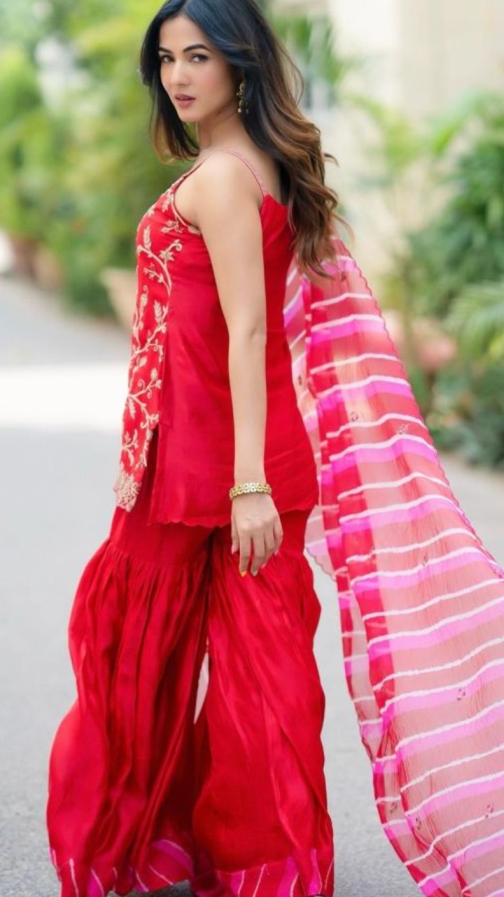 सोनल ने तस्वीर में रेड कलर का अनारकली सेट और फ्लेयर्ड प्लाजो पहना हुआ हैं। एक्ट्रेस के इस लुक को शादी के दौरान होने वाली रस्मों के दौरान पहना जा सकता हैं।