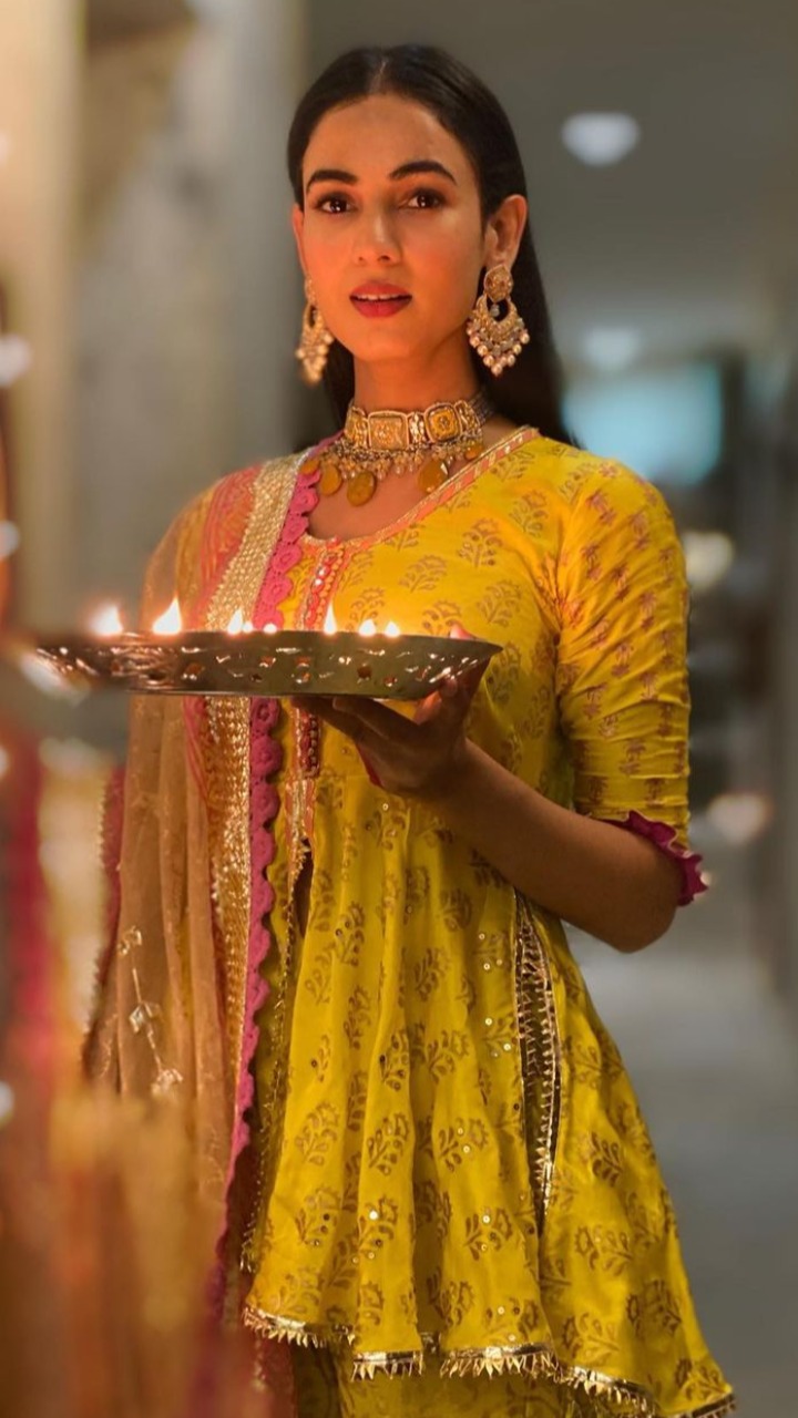 एक्ट्रेस पर येलो कलर काफी जचता हैं, तस्वीर में भी एक्ट्रेस येलो के शरारा सेट मे हाथों में थाली लिए बेहद ग्रेसफुल अंदाज में नजर आ रही हैं।