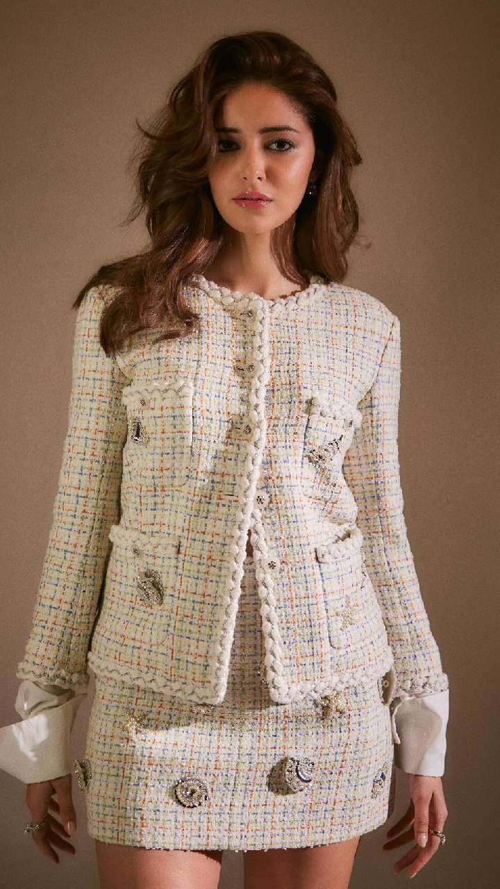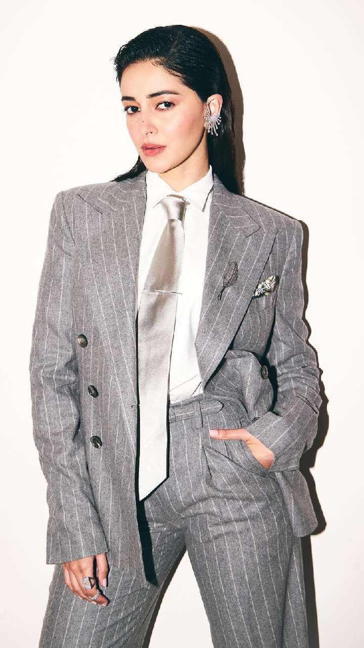 Ananya ने ग्रे पेंट और कोट के साथ व्हाइट शर्ट कैरी किया है। साथ ही, एक्ट्रेस की शिमरी टाई लुक को कंप्लीट कर रही है। आप पोनी हेयर स्टाइल के साथ लुक में चार चांद लगा सकती हैं।