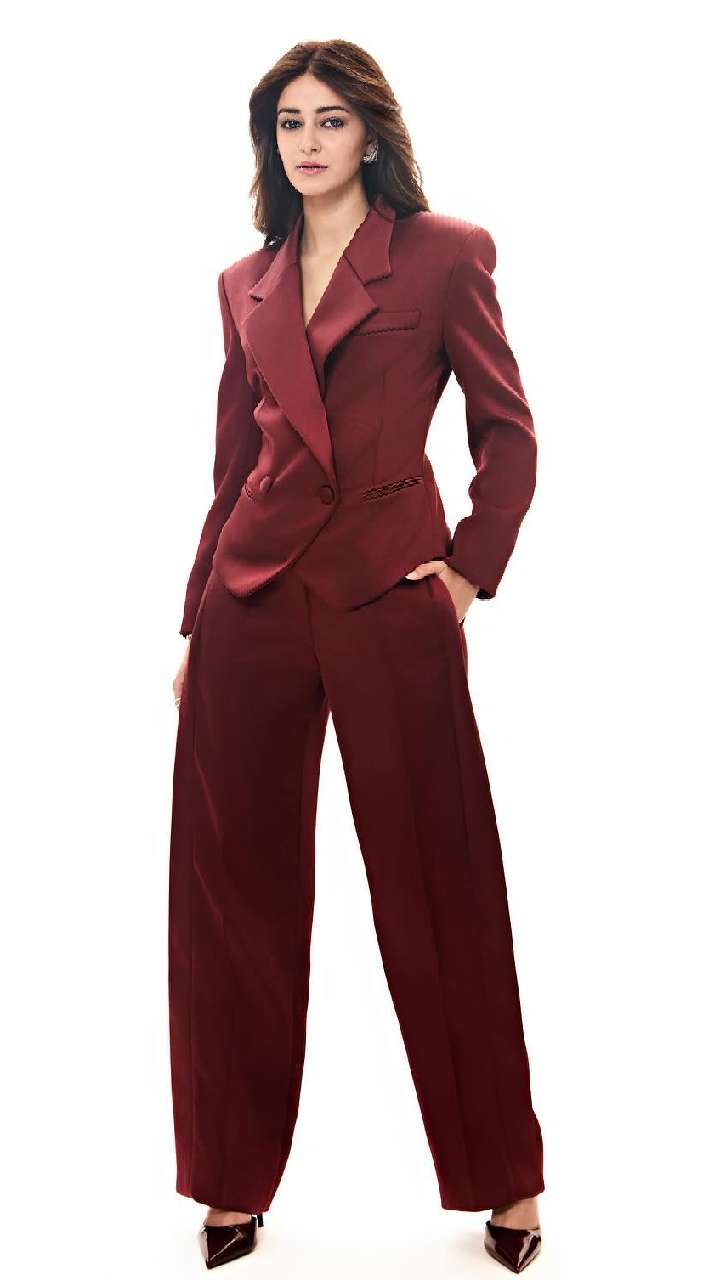 वाइन कलर के इस ब्लेजर लुक में एक्ट्रेस कमाल की लग रही हैं। आप ऑफिस में बॉसी पर्सनैलिटी के लिए इस लुक को कॉपी कर सकती हैं।