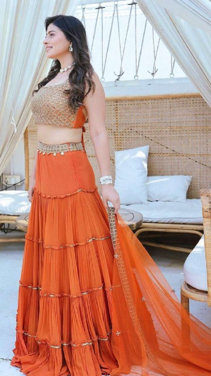 एक्ट्रेस ने तस्वीर में ऑरेंज कलर का रफल लहंगा और बैकलेस ब्लाउज पहना हुआ है।