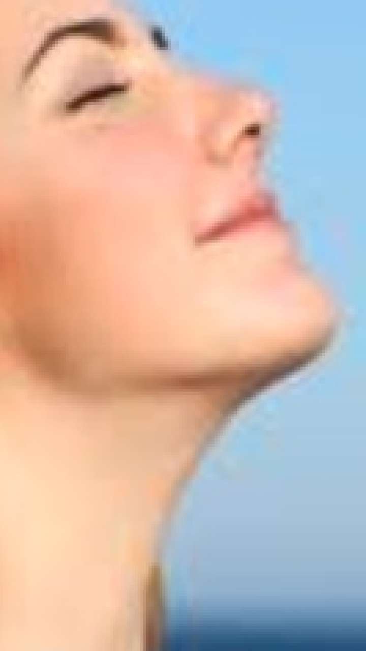 अब सिर को नीचे झुकाकर आंखों को नाक के अग्र भाग पर ध्यान केंद्रित कर सांस अंदर लें और बाहर छोड़ें।