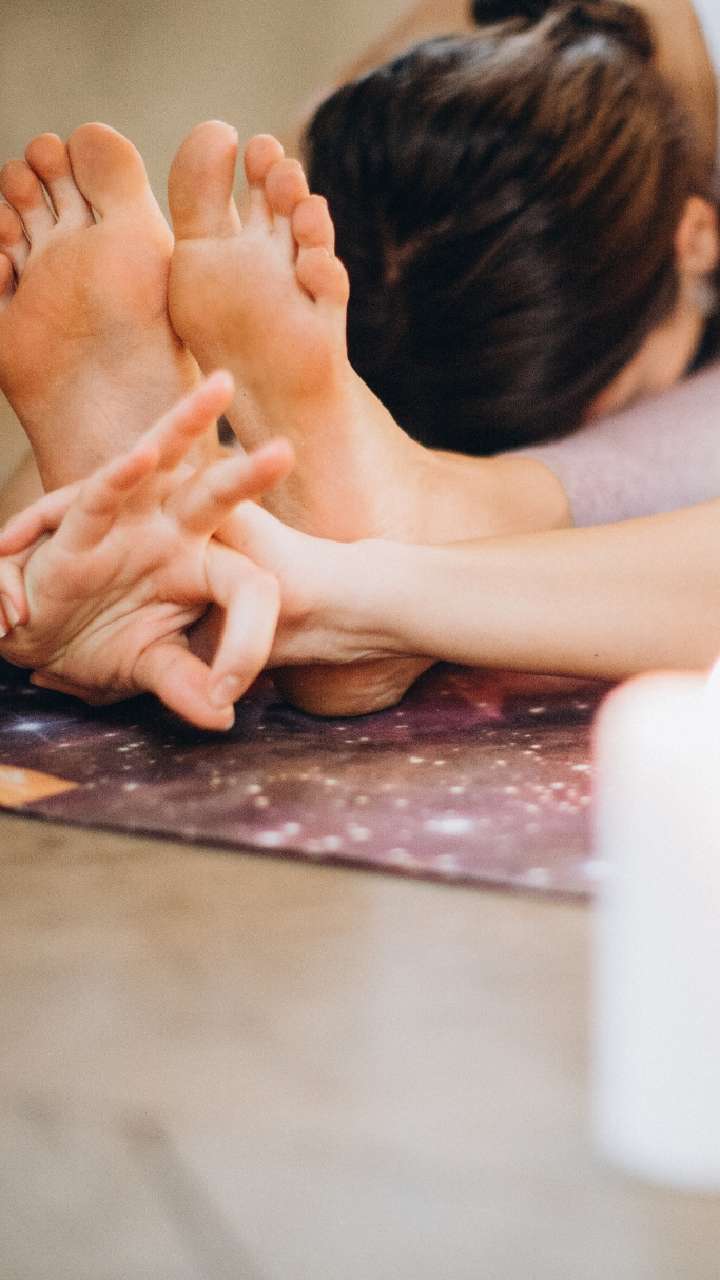शरीर को आगे की ओर झुकाने के बाद गहरी सांस लें। अब दोनों हाथों से अपने पैरों के तलवों को छूने की कोशिश करें। कुछ देर इसी स्थिति में रहें।
