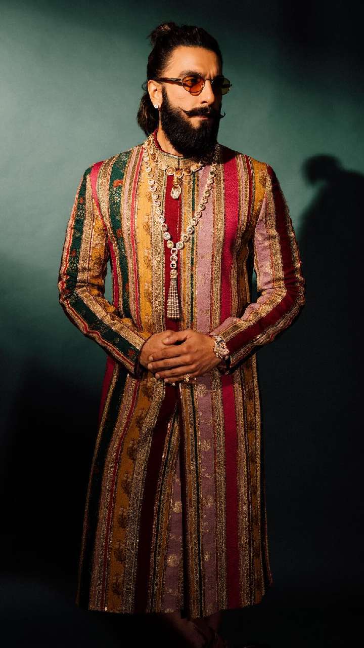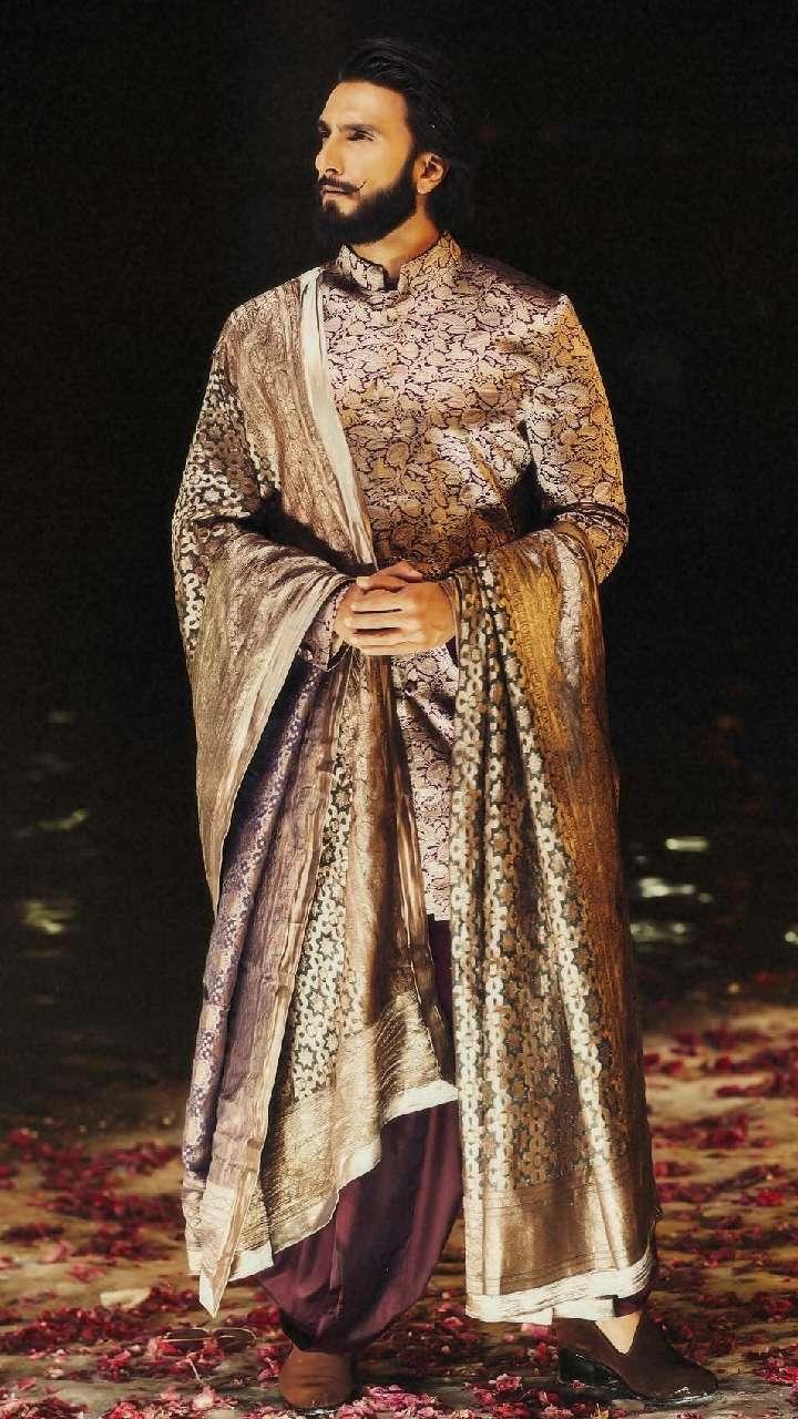 रणवीर सिंह इस ट्रेडिशनल लुक में काफी बेहतरीन लग रहे हैं। एक्टर का ये शेरवानी पर धोती पेंट स्टाइल लुक से यंग बॉयज इंस्पिरेशन ले सकते हैं। इसे पहनकर आप काफी स्टाइलिश नजर आएंगे।
