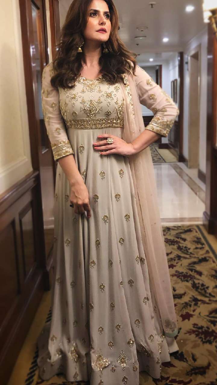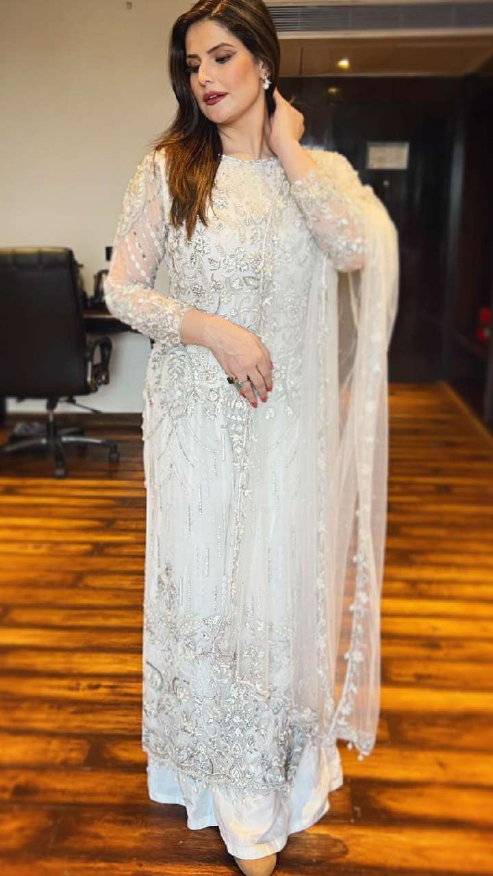 जरीना का व्हाइट कलर हेवी वर्क ए लाइन सूट आपको पार्टी में काफी अट्रैक्टिव लुक देने वाला है।
