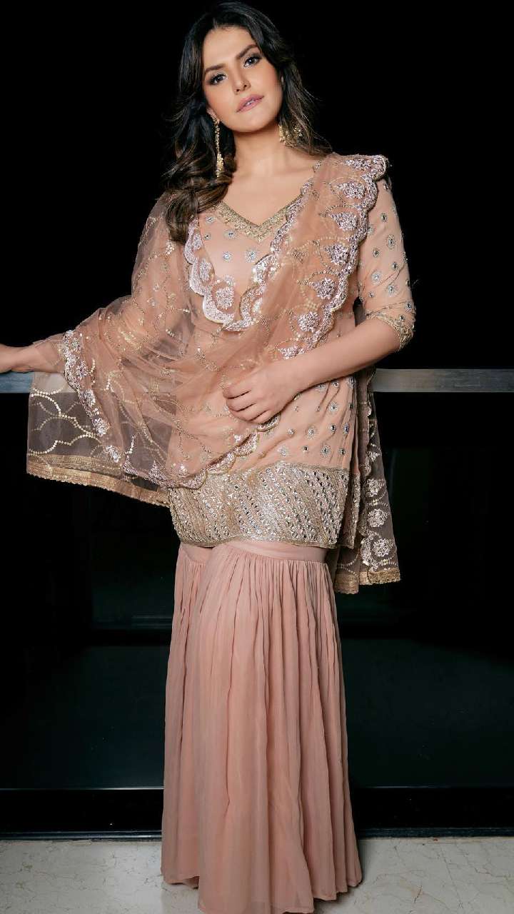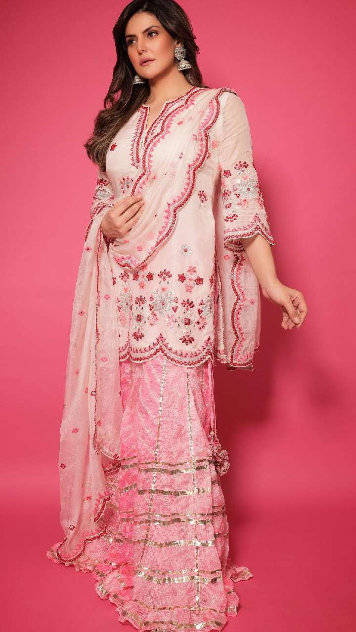 इस तरह के शरारा सूट इन दिनों काफी ट्रेंड में हैं। ऐसे में आप जरीन के व्हाइट और पिंक कॉम्बिनेशन वाले शरारा सूट को कैरी कर सकती हैं।