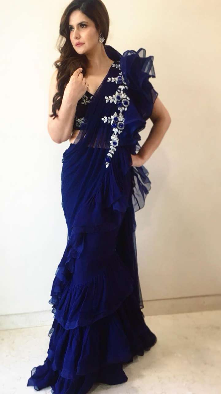 ब्लू कलर की साड़ी में जरीन खान का लुक बेहद सुंदर लग रहा है। आप भी एक्ट्रेस की तरह ही साड़ी कैरी कर सकती हैं।