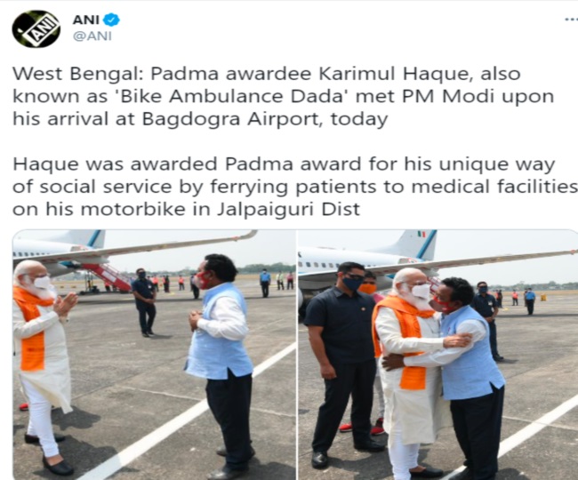 सिलीगुड़ी, इरफान-ए-आजम। West Bengal Assembly Election 2021: पश्चिम बंगाल विधानसभा चुनाव 2021 के दौरान दलीय उम्मीदवारों के समर्थन में शनिवार को सिलीगुड़ी में प्रचार करने पहुंचे प्रधानमंत्री नरेंद्र मोदी से उत्तर बंगाल के जाने-माने समाजसेवी पद्मश्री करीमुल हक उर्फ 'बाइक एंबुलेंस' उर्फ 'एंबुलेंस दादा' ने मुलाकात की। अपने विशेष विमान से उड़ान भर कर पीएम मोदी जब बागडोगरा एयरपोर्ट पर उतरे तो वहां पहले से ही प्रतीक्षारत करीमुल हक उनके पास गए और मुलाकात की। दोनों ने एक-दूसरे से हाथ मिलाया व एक-दूसरे के गले मिले। पीएम मोदी ने उनका कुशलक्षेम पूछा व अभिवादन किया। 'एंबुलेंस दादा' के नाम से मशहूर करीमुल हक जलपाईगुड़ी के जिले के माल प्रखंड के राजाडांगा ग्राम पंचायत अंतर्गत धलाबाड़ी गांव के निवासी हैं। वह समाजसेवा के क्षेत्र में बड़ी मिसाल बन चुके हैं। अपने आस-पास के दर्जनों गांवों के गरीब जरूरतमंदों को पिछले दशक भर से भी ज्यादा समय से वह निःशुल्क बाइक एंबुलेंस सेवा देते आ रहे हैं। अब तक उन्होंने लगभग चार हजार लोगों को निःशुल्क बाइक एंबुलेंस सेवा दी है। उनके झोपड़ीनुमा घर में ही निःशुल्क क्लीनिक भी चलता है, जहां लोगों की कुछ स्वास्थ जांच भी हो जाती है और दवाएं भी मिल जाती हैं। इसके अलावा यहां-वहां से जुटा कर नए-पुराने कपड़े, दाना-पानी, किताब-कलम व कॉपी आदि से भी वह जरूरतमंदों की सेवा करते रहते हैं।