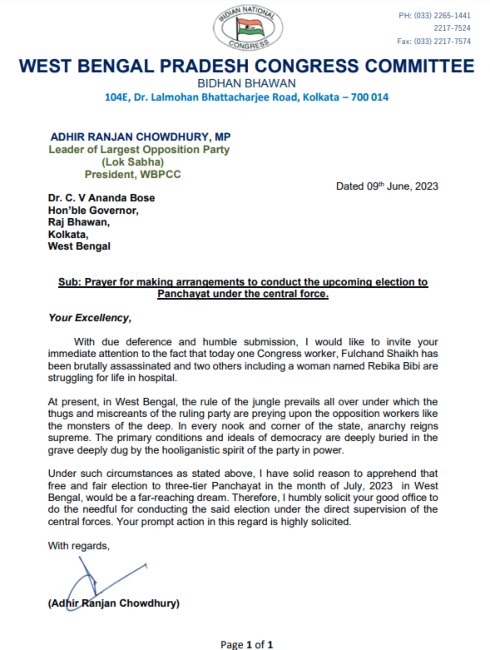 West Bengal | Congress MP Adhir Ranjan Chowdhury writes to Governor urging him to arrange Central forces during the Panchayat elections to have free and fair elections. pic.twitter.com/zzWkUyYhvP
