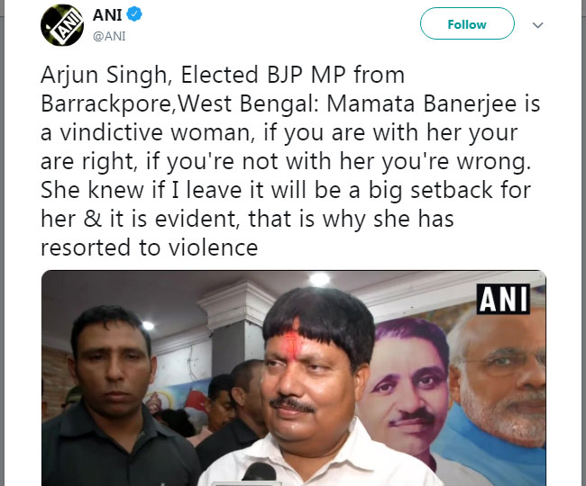 भाजपा सांसद अर्जुन सिंह ने ममता बनर्जी को बताया प्रतिशोधी महिला
