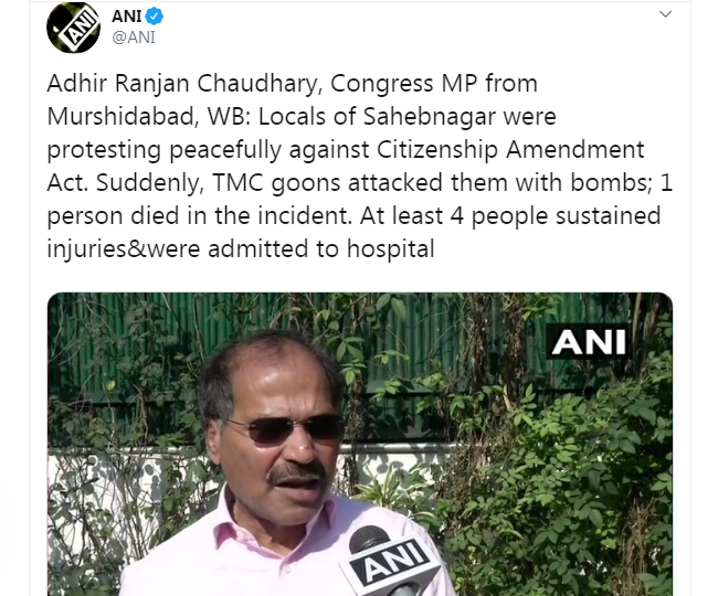 कांग्रेस सांसद और लोकसभा में संसदीय दल के नेता अधीर रंजन चौधरी ने हिंसा के लिए सत्ताधारी तृणमूल कांग्रेस को जिम्मेदार ठहराया। कहा कि साहब नगर इलाके में लोग सीएए और एनआरसी के खिलाफ शांतिपूर्ण प्रदर्शन कर रहे थे। अचानक टीएमसी के गुंडे वहां पहुंचे और हमला कर दिया। उनकी ओर से की गई बमबाजी और गोलीबारी में एक व्यक्ति की मौके पर ही मौत हो गई। जबकि चार घायल हुए हैं, जिन्हें अस्पताल में भर्ती कराया गया है।