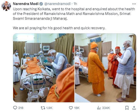 अस्पताल पहुंचने के बाद उन्होंने महाराज के स्वास्थ्य के बारे में जानकारी ली। इससे पहले रामकृष्ण मिशन व मठ के अध्यक्ष स्वामी आत्मस्थानंद जी महाराज मई 2015 में जब कोलकाता के अस्पताल में भर्ती थे तो पीएम मोदी उन्हें भी देखने के लिए पहुंचे थे। स्वामी आत्मस्थानंद जी महाराज के बारे में कहा जाता है कि वे पीएम मोदी के आध्यात्मिक गुरु थे।