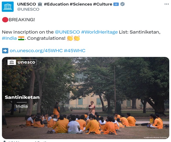पश्चिम बंगाल के शांतिनिकेतन को यूनेस्को की विश्व धरोहर सूची में शामिल किया गया है। शांतिनिकेतन में ही कवि रवींद्रनाथ टैगोर ने एक सदी पहले विश्वभारती की स्थापना की थी। यूनेस्को ने रविवार को इंटरनेट मीडिया एक्स (पूर्व में ट्विटर) पर एक पोस्ट में यह घोषणा की। पीएम ने कहा कि शांतिनिकेतन को यूनेस्को की विश्व धरोहर सूची में शामिल किया जाना पूरे देशवासियों के लिए गर्व का विषय है।