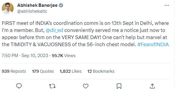 'X' (पूर्व में ट्विटर) पर अभिषेक बनर्जी ने ईडी की आलोचना करते हुए लिखा, 'भारत के समन्वय आयोग की पहली बैठक 13 सितंबर को दिल्ली में है,जिसका मैं एक सदस्य हूं। लेकिन,ईडी ने अभी-अभी मुझे उसी दिन उनके सामने उपस्थित होने के लिए नोटिस भेजा है! प्रधानमंत्री नरेंद्र मोदी पर परोक्ष हमला बोलते हुए बनर्जी ने रविवार को एक्स पर पोस्ट करते हुए कहा, कोई भी 56 इंच की छाती वाले मॉडल की कायरता और शून्यता पर आश्चर्यचकित हुए बिना नहीं रह सकता।'