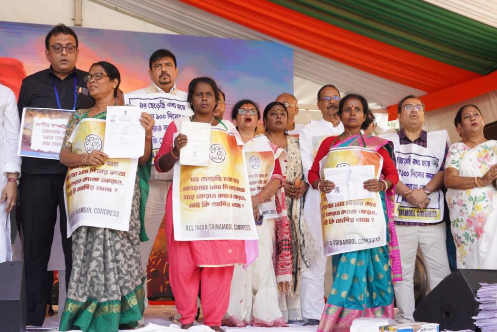 तृणमूल के राष्ट्रीय महासचिव व सांसद अभिषेक बनर्जी की अगुवाई में पार्टी के सभी सांसदों, विधायकों व मंत्रियों ने बंगाल से गए कार्यकर्ताओं और बड़ी संख्या में मनरेगा जाब कार्ड धारकों के साथ दोपहर एक बजे से जंतर-मंतर पर धरना शुरू किया। इस दौरान हाथों में तख्तियां और बैनर पोस्टर लेकर तृणमूल नेता व कार्यकर्ता केंद्र के खिलाफ नारेबाजी कर रहे हैं।
