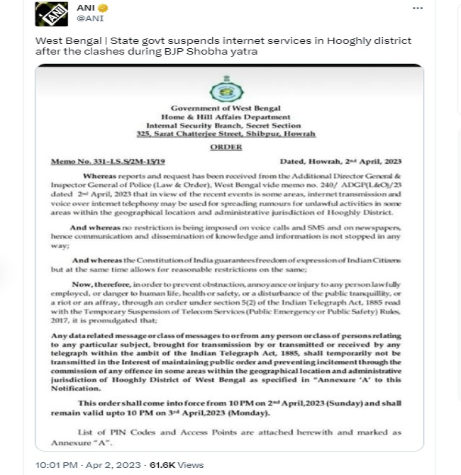 कोलकाता, राज्य ब्यूरो। बंगाल में रामनवमी के दिन शुरू हुई हिंसा थमने का नाम नहीं ले रही है। हावड़ा के बाद अब हुगली जिले में रामनवमी के उपलक्ष्य में शोभायात्रा के दौरान दो समूहों के बीच हिंसक झड़प सामने आई है। इसके बाद राज्य सरकार ने इंटरनेट सेवा पर रोक लगा दी।