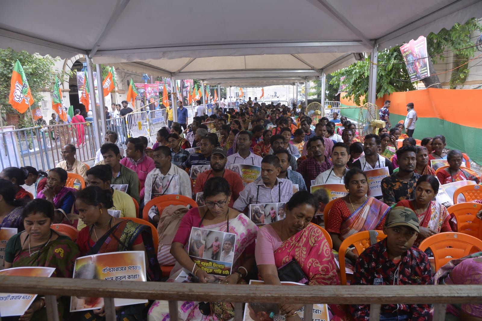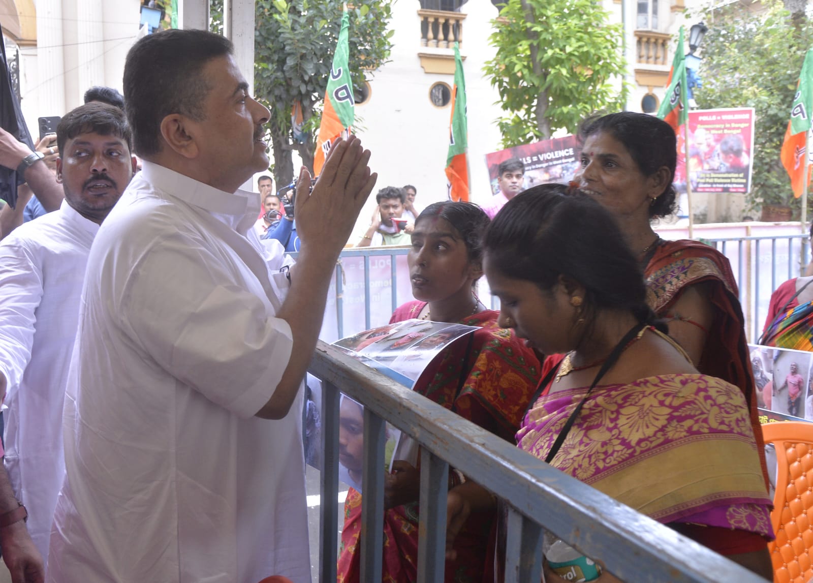 राज्य ब्यूरो, कोलकाता। कलकत्ता हाई कोर्ट की अनुमति के बाद बंगाल विधानसभा में नेता प्रतिपक्ष सुवेंदु अधिकारी ने लोकसभा चुनाव के बाद राज्य में हुई हिंसा के पीड़ितों के साथ रविवार सुबह यहां राजभवन के बाहर एक दिवसीय धरना प्रदर्शन शुरू किया। धरने में कई अन्य भाजपा नेता और बड़ी संख्या में पार्टी कार्यकर्ता भी शामिल हैं। सभी भाजपा नेता अपने गले में चुनावी हिंसा की तस्वीरें भी लटकाए हुए हैं।