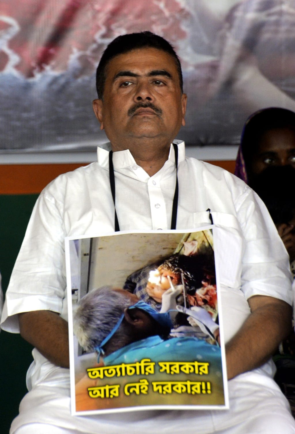 West Bengal: राजभवन के बाहर सुवेंदु अधिकारी का धरना, चुनावी हिंसा की तस्वीरें गले में लटकाए नजर आए भाजपा नेता