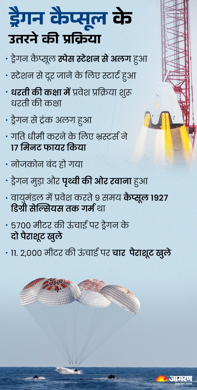अंतरिक्ष यात्रियों को स्पेस स्टेशन से धरती पर पहुंचने में 17 घंटे का लंबा वक्त लगा। नासा ने सुनीता की वापसी का प्लान बहुत सावधानी से तैयार किया था। सुनीता विलियम्स और उनके साथ फंसे दूसरे अंतरिक्ष यात्री को स्पेसएक्स कंपनी के जिस ड्रैगन विमान से लाया गया वह आग के गोले से कम नहीं था। आगे समझते हैं उनके सफर की पूरी कहानी।