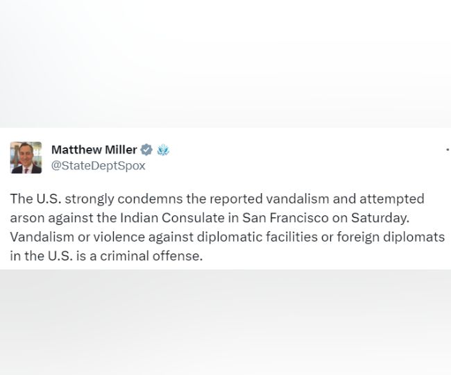इधर, इस घटना की अमेरिका ने कड़ी निंदा की है। अमेरिका ने इसे गंभीर अपराध करार दिया है। विदेश विभाग के प्रवक्ता मैथ्यू मिलर ने कहा कि अमेरिका, सैन फ्रांसिस्को में भारतीय वाणिज्य दूतावास के खिलाफ कथित बर्बरता और आगजनी के प्रयास की कड़ी निंदा करता है।