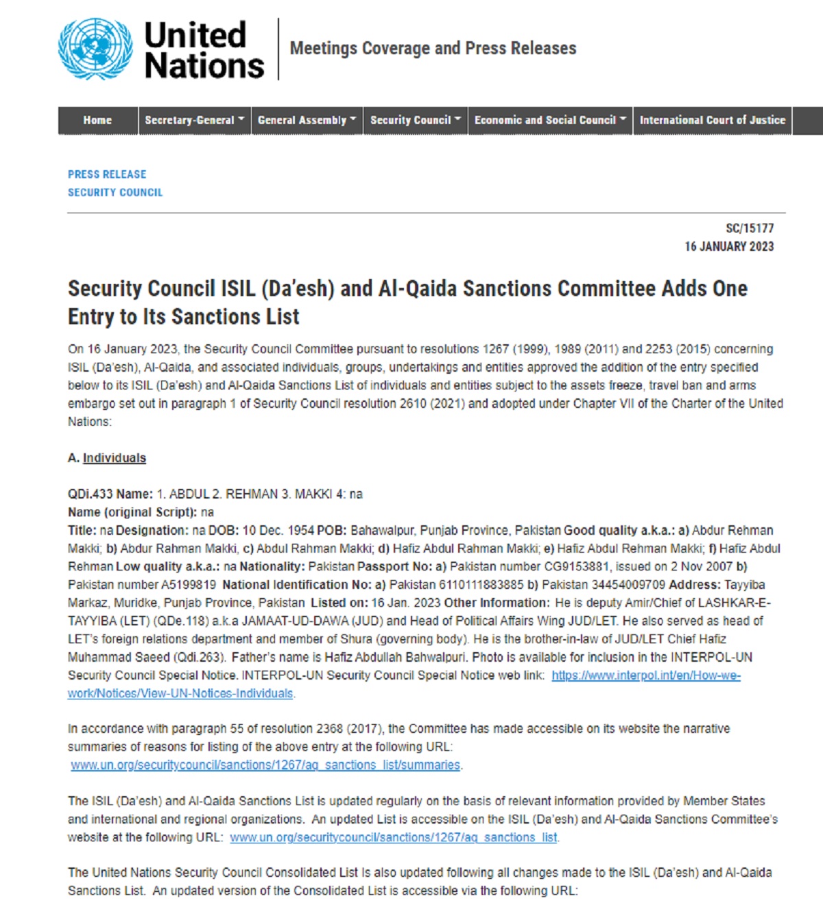यूएन ने इस संबंध में एक बयान जारी किया है। बयान में कहा गया कि यूएन की समितियों ने 16 जनवरी 2023 को अब्दुल रहमान मक्की को वैश्विक आतंकी घोषित किया। इसके बाद दुनियाभर में मक्की की संपत्ति को फ्रीज किया जा सकेगा। इसके अलावा मक्की की यात्रा पर भी प्रतिबंध लगेगा।