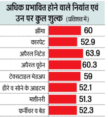 शुल्क में इस बेतहाशा बढ़ोतरी से भारतीय वस्तुएं अमेरिका के बाजार में काफी महंगी हो जाएंगी और इससे भारत का 30-35 अरब डॉलर का निर्यात प्रभावित होगा। मुख्य रूप से समुद्री उत्पाद खासकर झींगा, आर्गेनिक केमिकल्स, अपैरल, टेक्सटाइल मेड-अप्स, हीरे व सोने के जेवरात, मशीनरी और मैकेनिकल उपकरण, फर्नीचर और बेड जैसे आइटम के निर्यात प्रभावित होंगे।