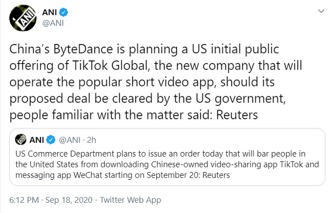वॉशिंगटन, एएनआइ। चीन की ByteDance कंपनी की Tiktok को लेकर किसी अमेरिकी कंपनी से डील की बात चल रही है। इस डील के बाद Tiktok के ग्लोबल ऑपरेशन को यही कंपनी देखेगी, लेकिन इसके लिए अमेरिकी सरकार की इजाजत लेनी होगी। गौरतलब है कि Tiktok छोटे पापुलर वीडियो के कारण विख्यात ऐप है, लोग जिससे परिवार के जैसा जुड़ाव महसूस करते हैं।