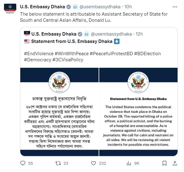 ढाका में अमेरिकी दूतावास ने सभी पक्षों से शांति और संयम बरतने का आह्वान किया। एक्स से बात करते हुए, ढाका में अमेरिकी दूतावास ने कहा, "संयुक्त राज्य अमेरिका 28 अक्टूबर को ढाका में हुई राजनीतिक हिंसा की निंदा करता है। एक पुलिस अधिकारी, एक राजनीतिक कार्यकर्ता की हत्या और एक अस्पताल को जलाने की घटना सामने आई है जोकि अस्वीकार्य है। यह घटना पत्रकारों सहित नागरिकों के खिलाफ हिंसा है। हम सभी पक्षों से शांति और संयम का आह्वान करते हैं। हम संभावित वीजा प्रतिबंधों के लिए सभी हिंसक घटनाओं की समीक्षा करेंगे।"