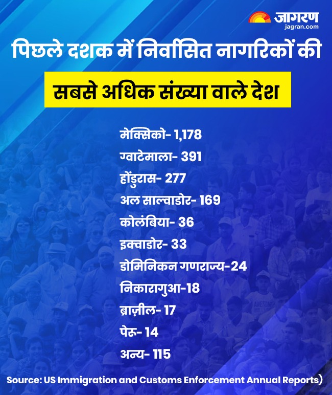 पिछले दशक में जिन शीर्ष 10 देशों के नागरिकों को निर्वासित किया गया, वे सभी अमेरिका में स्थित हैं। निर्वासित किए जाने वाले शीर्ष राष्ट्रीयताओं में भारतीय शामिल नहीं हैं, लेकिन पड़ोस की सूची में सबसे ऊपर हैं।