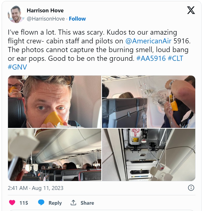 फ्लोरिडा विश्वविद्यालय के प्रोफेसर हैरिसन होव इस विमान में सवार थे। उन्होंने सोशल मीडिया पर अनुभव साझा करते हुए लिखा," मैंने कई बार विमान से सफर किया है, लेकिन यह एक डरावना मंजर था।" उन्होंने एक तस्वीर भी साझा की, जिसमें देखा जा सकता है कि विमान के अंदर ऑक्सीजन मास्क लटके हुए हैं। वहीं, कई यात्री मास्क के जरिए ऑक्सीजन ले रहे हैं।