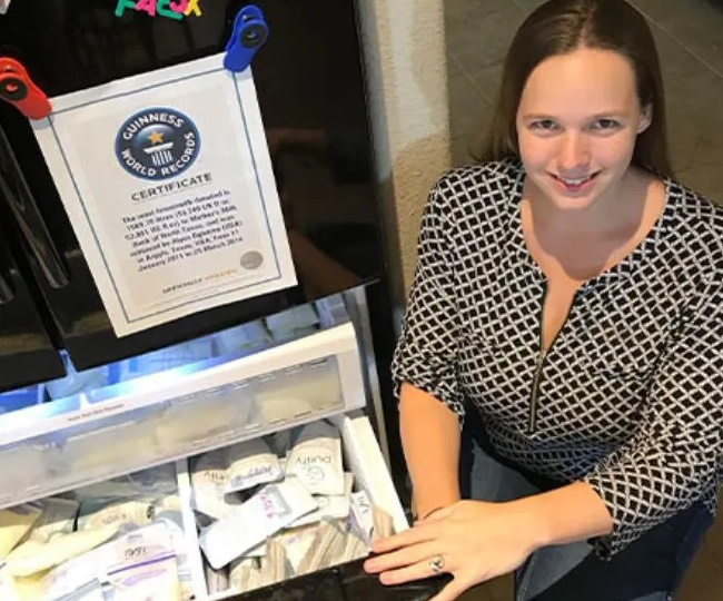 अमेरिका की एक महिला ने ब्रेस्ट मिल्क दान करके विश्व रिकॉर्ड बनाया है। महिला अभी तक 2600 लीटर से अधिक दूध दान कर चुकी है। महिला ने दूध दान करना 2010 से शुरू किया था। महिला ने बताया कि दूध दान करने के बारे में उसे एक नर्स से जानकारी मिली थी। साल 2014 में भी महिला सबसे अधिक ब्रेस्ट मिल्क दान करके विश्व रिकॉर्ड बना चुकी है।