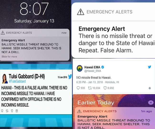 आपको बता दें कि सुबह 8 बजकर 7 मिनट (हवाई का स्थानीय समय) पर सभी फोन पर एक आपातकालीन चेतावनी भेजी गई, जिसमें कहा गया कि हवाई की सीमा के आसपास बैलिस्टिक मिसाइल से हमले का खतरा है। तत्काल आश्रय की तलाश करें। मगर इस घटना के लगभग 10 मिनट बाद हवाई आपात प्रबंधन एजेंसी ने ट्वीट किया कि ऐसा कोई खतरा नहीं है। मिसाइल से हवाई को कोई खतरा नहीं हैं। वहीं, 8 बजकर 45 मिनट पर दूसरा आपातकालिन अलर्ट जारी हुआ।