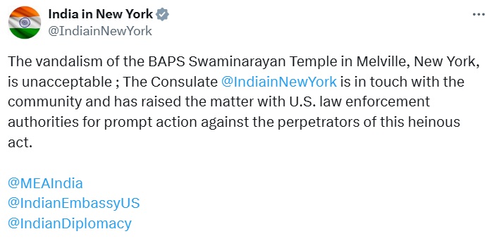 इस घटना को लेकर इंडियन मिशन ने एक्स पर जानकारी दी,"न्यूयॉर्क के मेलविले में बीएपीएस स्वामीनारायण मंदिर की बर्बरता अस्वीकार्य है। न्यूयॉर्क में भारतीय वाणिज्य दूतावास समुदाय के संपर्क में है और इस जघन्य कृत्य के अपराधियों के खिलाफ तुरंत कार्रवाई के लिए अमेरिकी लॉ एनफोर्समेंट अधिकारियों के साथ मामला उठाया है।"